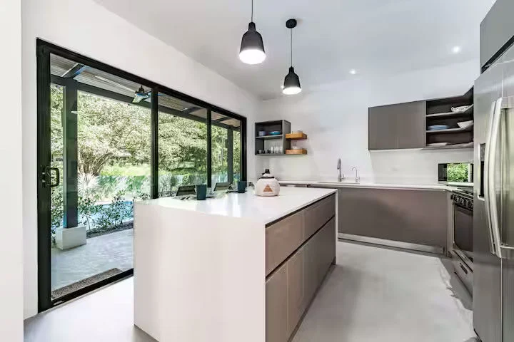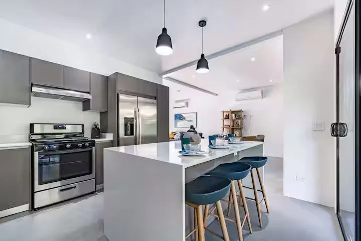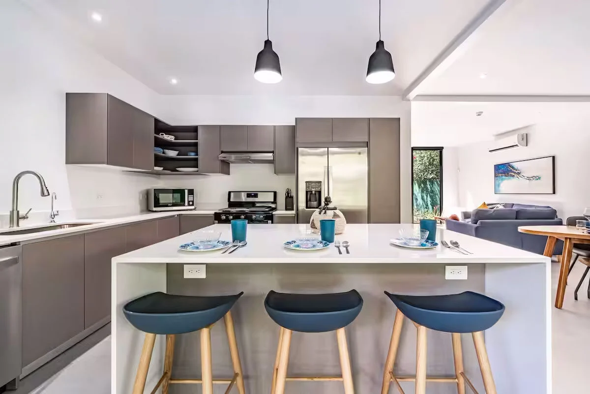 The kitchen is often the heart of any home, and at the Shaka House, it’s no different. Whether you’re an experienced chef or just looking to make simple, home-cooked meals during your stay, our kitchen is fully equipped to make your culinary journey a delightful one. The kitchen features a gas range, dishwasher, and a full range of small appliances and service items. The large island is a perfect spot to gather for a quick snack or perch to watch the chef in action.