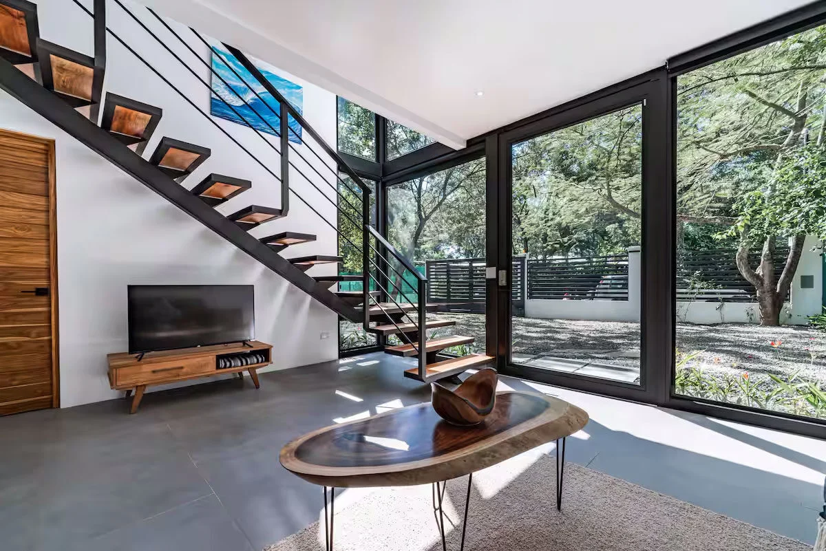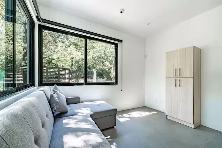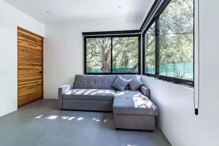 Large windows flood the room with natural light during the day, creating a bright and cheerful ambiance. When you’re ready for some privacy, the blinds can be lowered for a cozy atmosphere.