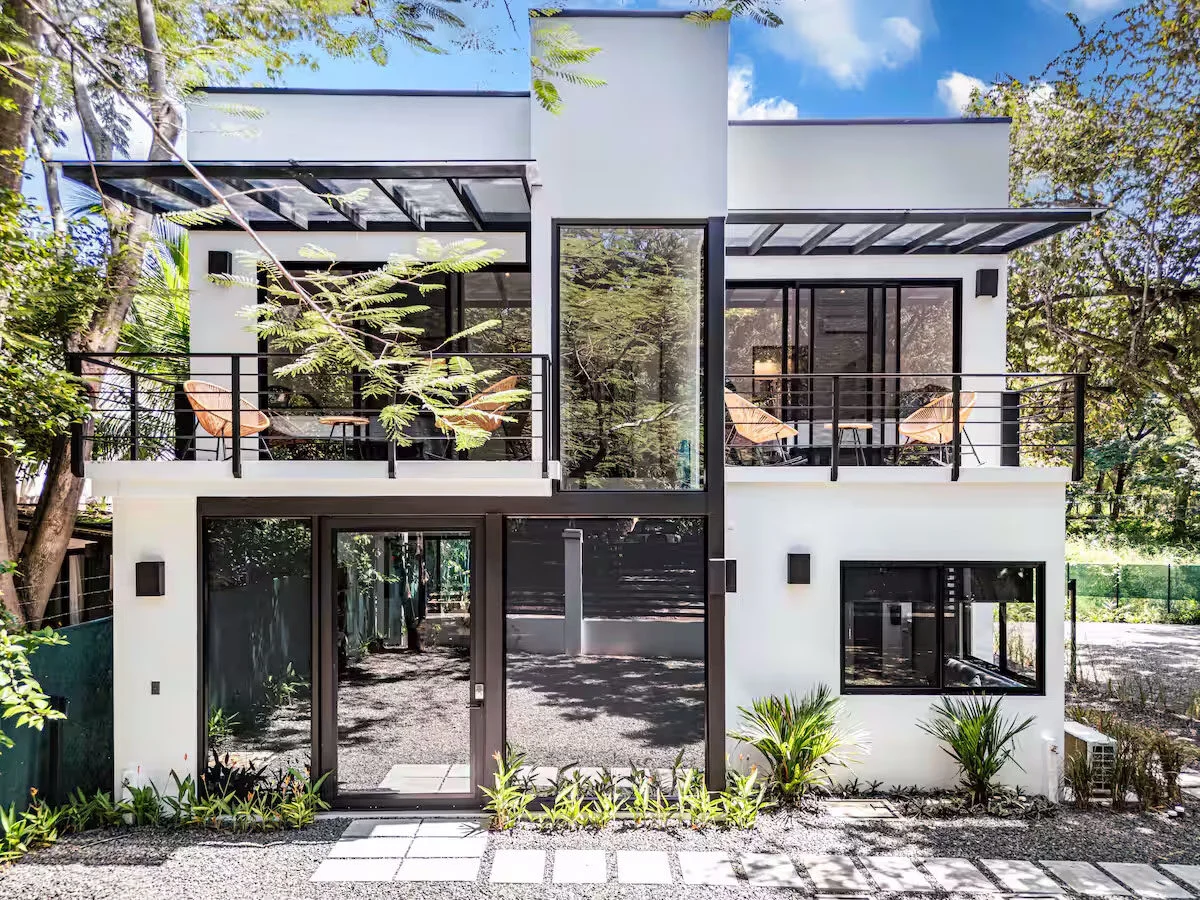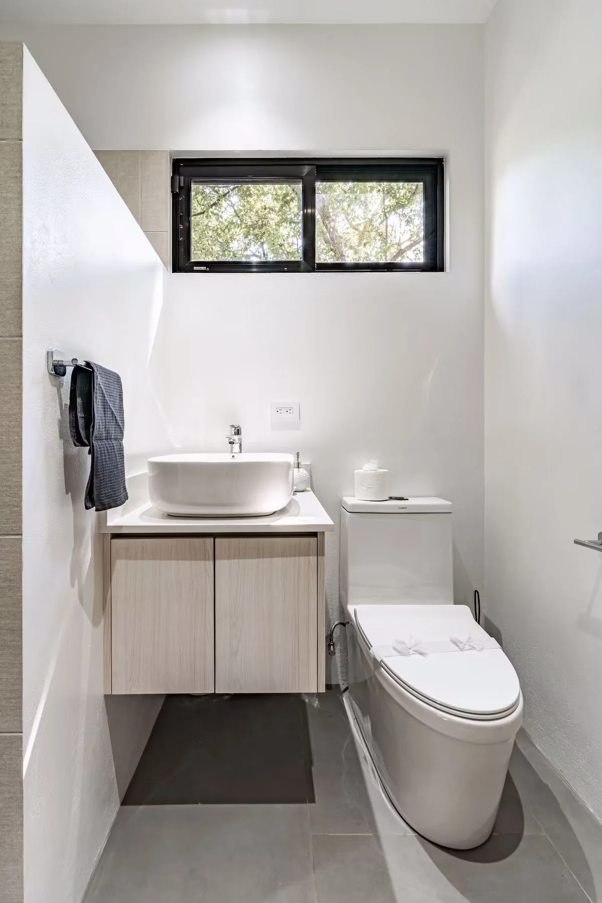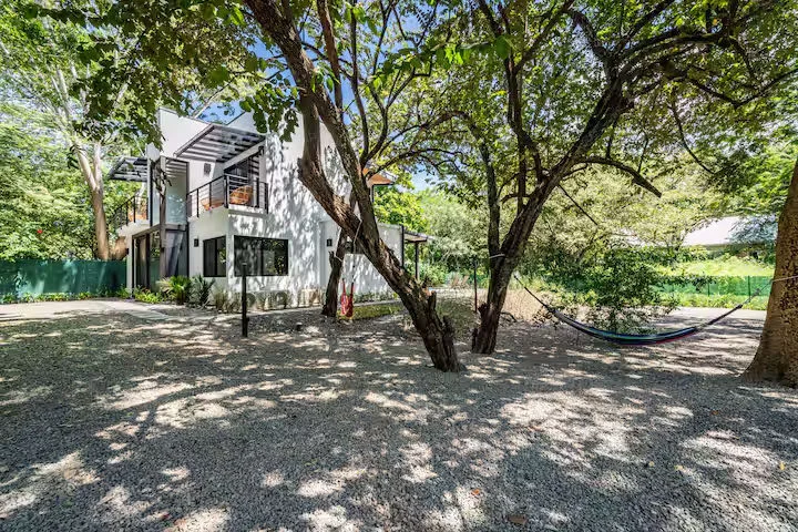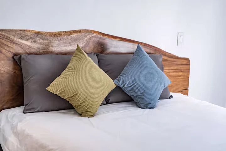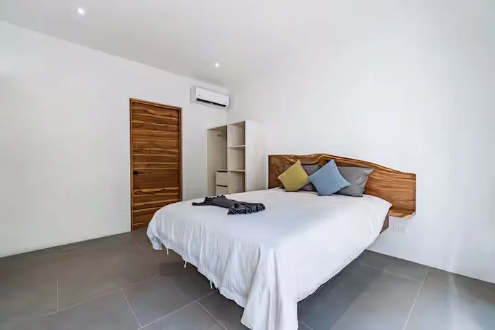 The master bedroom is generously spacious, providing ample room for you to unwind and rejuvenate. It features a plush king-size bed built from local Guanacaste wood and dressed with high-quality linens and pillows, ensuring a restful night’s sleep. The room is adorned with carefully chosen artwork and décor to evoke a sense of tranquility. Connected to the master bedroom is a private ensuite bathroom, designed for your convenience and privacy. It boasts modern fixtures, a spacious walk-in shower and double vanity.
