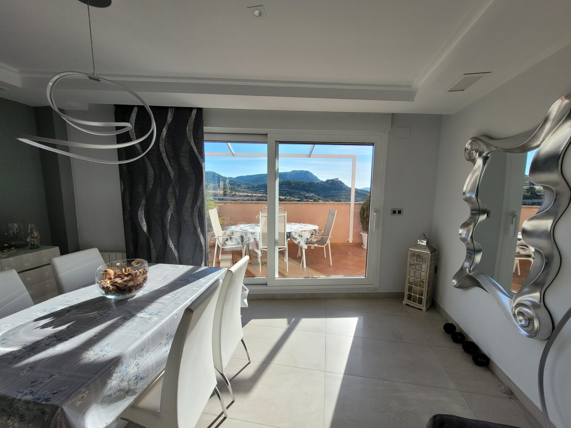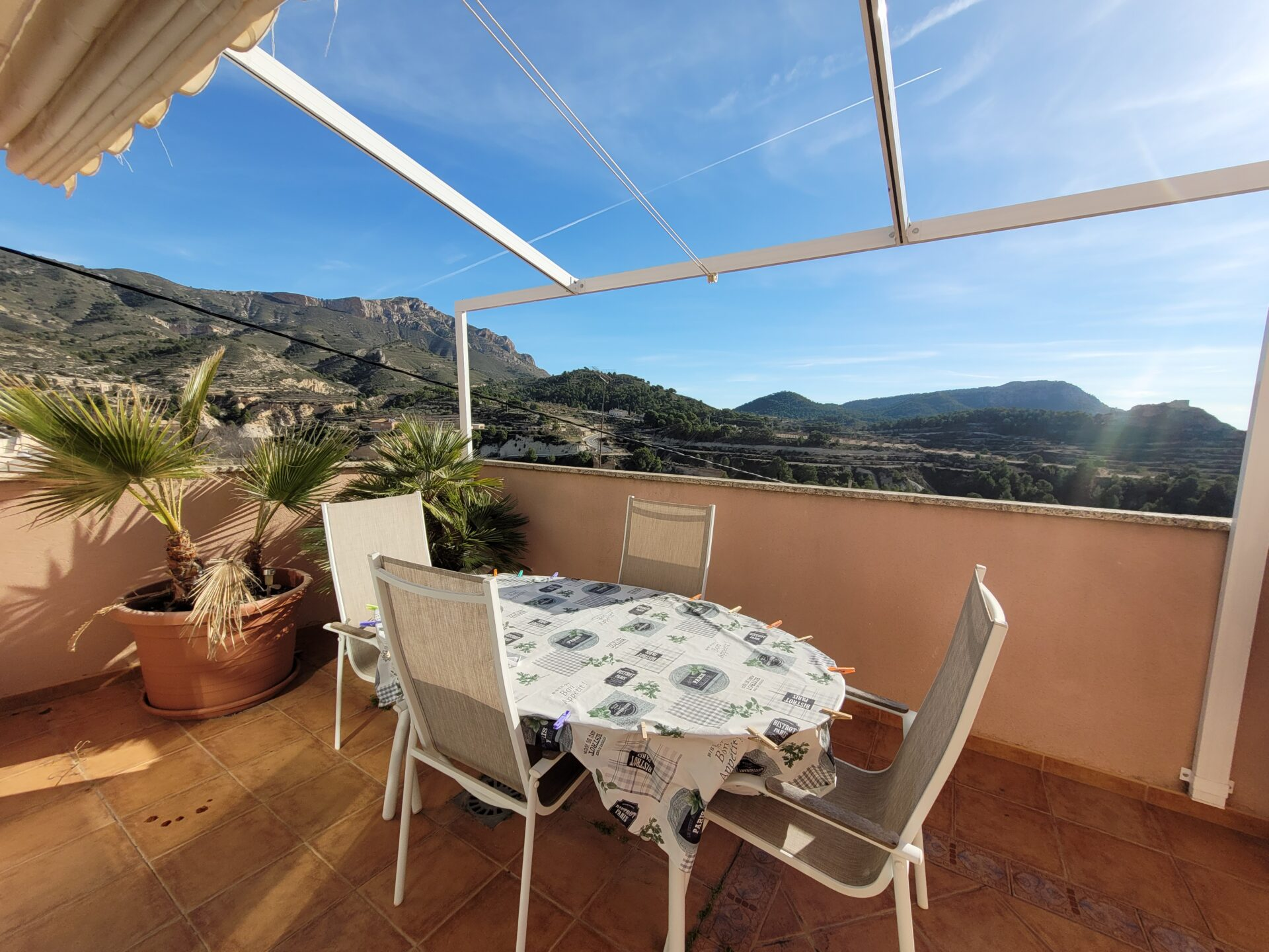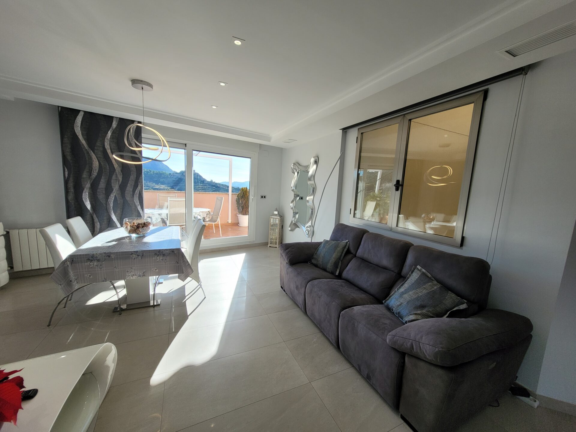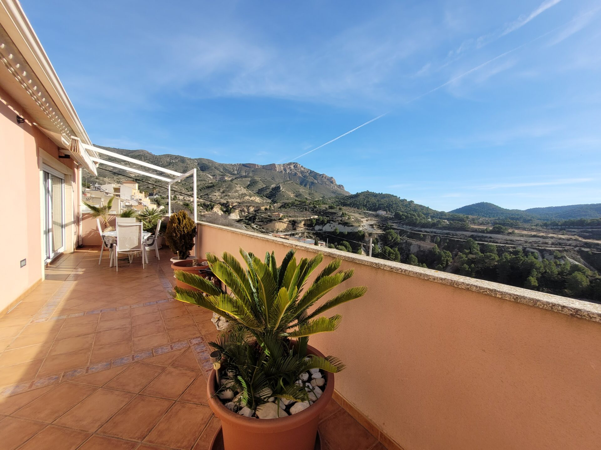 This stylish accommodation is perfect for family or solo trips. A luxurious penthouse with stunning views, located in the Tibi Valley,20 km from Alicante. It features three master bedrooms, two bathrooms, a spacious living/dining room/kitchen surrounded by terraces from all rooms, and a rear terrace with an outdoor dining area. The perfect place for a few days of relaxation surrounded by nature, just 20 minutes from Alicante city center and its best beaches. Enjoy the mountains and sea in style.