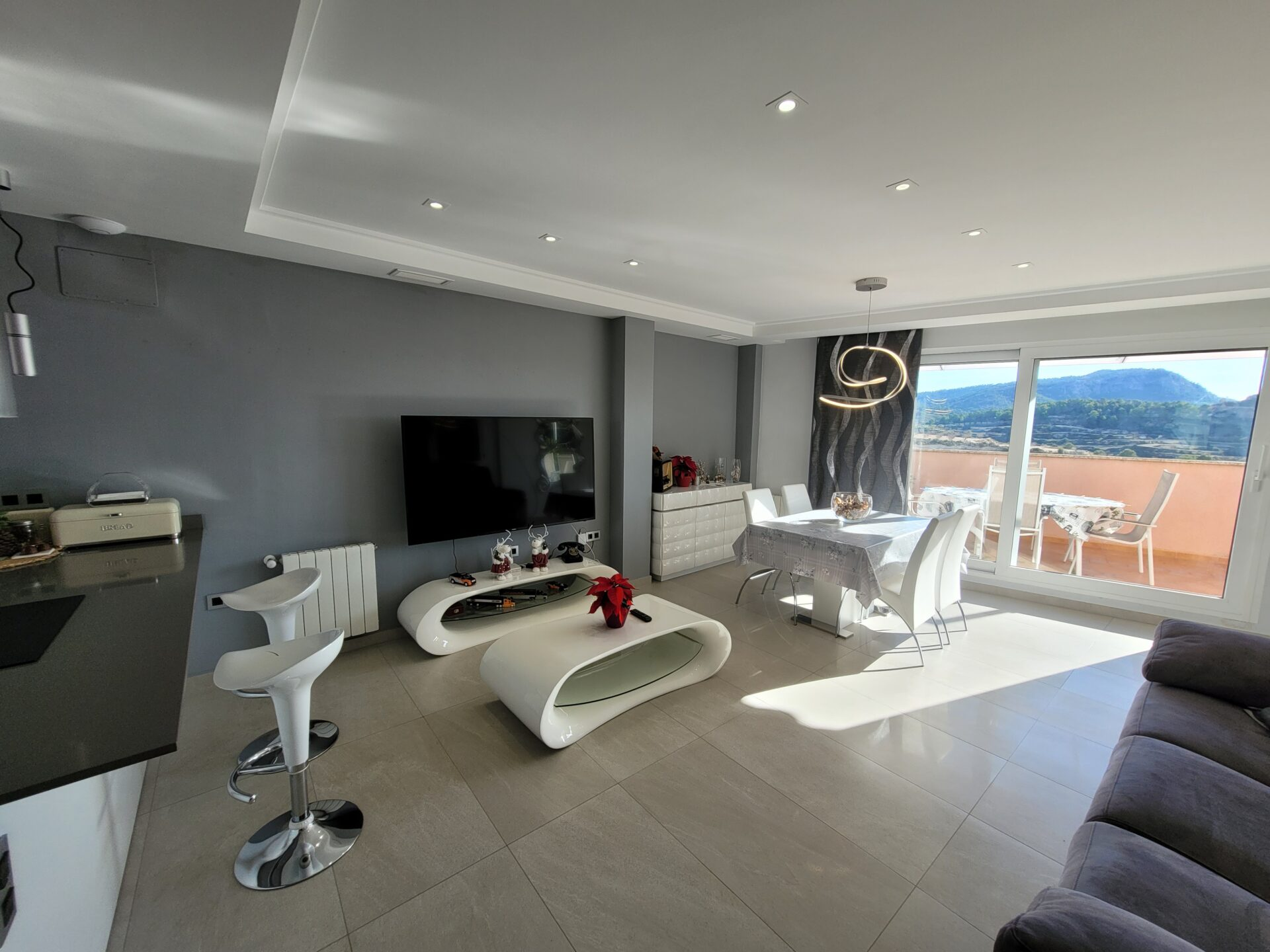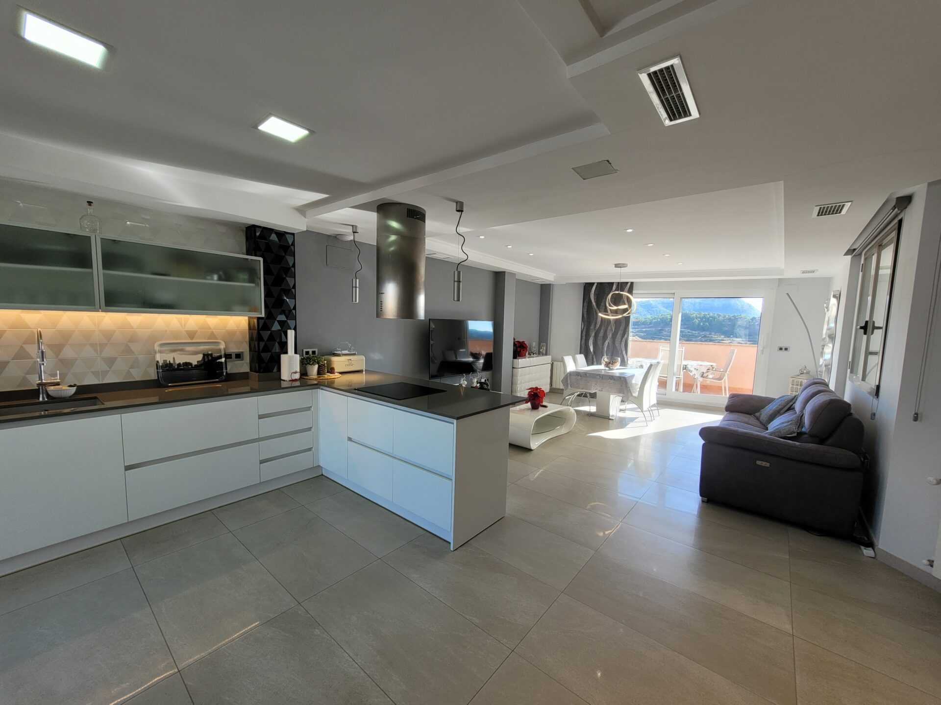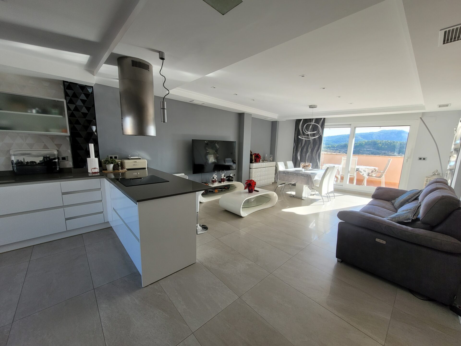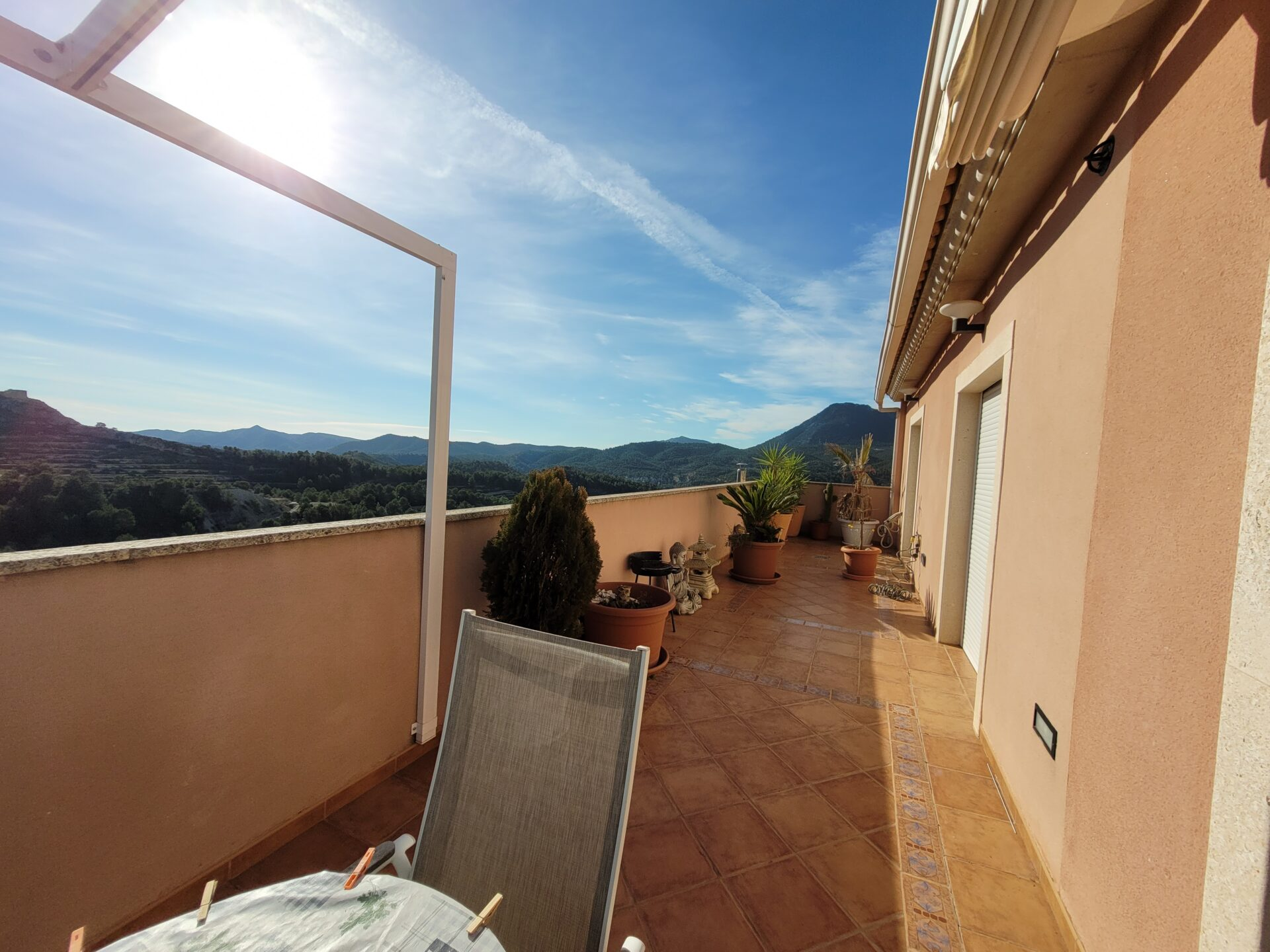 This stylish accommodation is perfect for family or solo trips. A luxurious penthouse with stunning views, located in the Tibi Valley,20 km from Alicante. It features three master bedrooms, two bathrooms, a spacious living/dining room/kitchen surrounded by terraces from all rooms, and a rear terrace with an outdoor dining area. The perfect place for a few days of relaxation surrounded by nature, just 20 minutes from Alicante city center and its best beaches. Enjoy the mountains and sea in style.