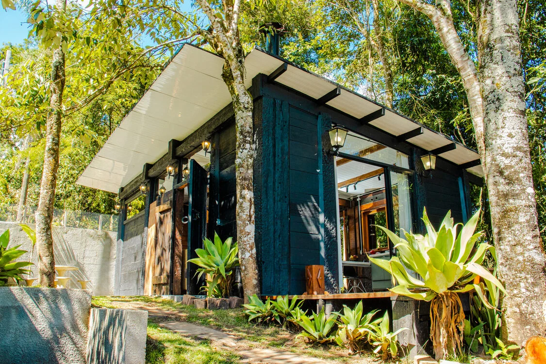 A cabana fica cercada por mata nativa, garantindo total privacidade, mas fica a menos de 5 minutos do centro da cidade. Um equilíbrio perfeito entre isolamento e praticidade.