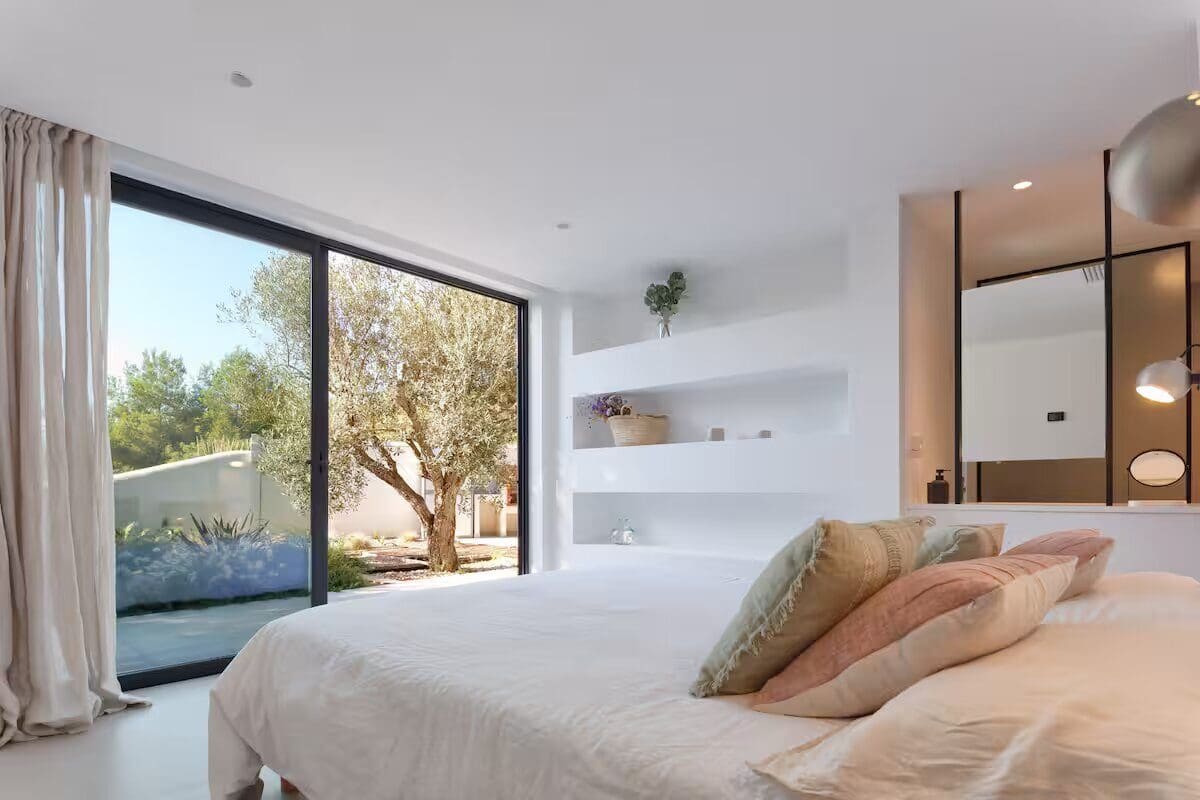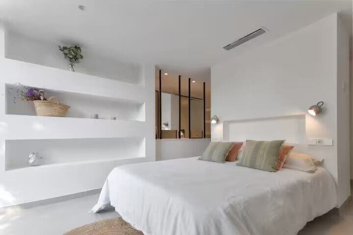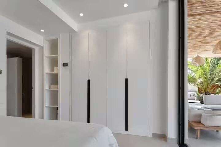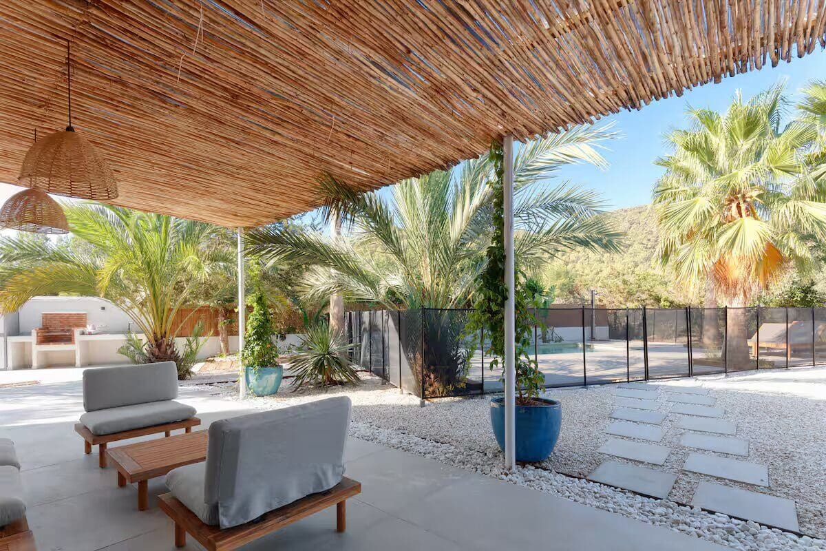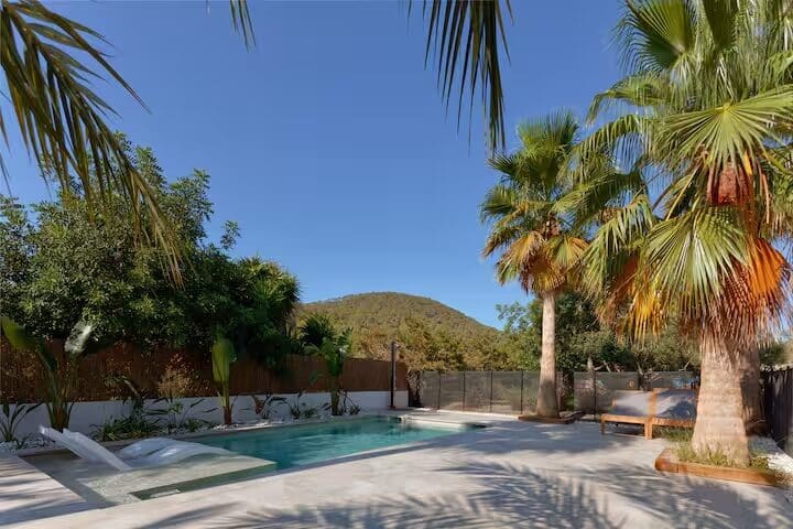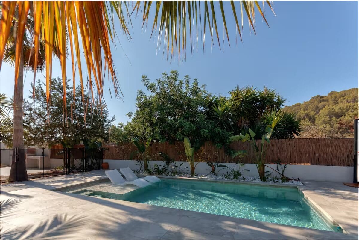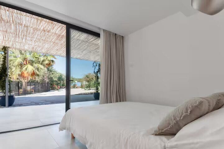 With an excellent location for accessing the best beaches on the southwest coast of the island, Can Romaní stands out for its minimalist design that combines simplicity and quality, featuring spacious and functional areas that seamlessly connect with the outdoors. Surrounded by lush Mediterranean vegetation, it is the ideal place for both adults and families looking to relax and enjoy the island’s natural beauty. The Space This beautiful 3-bedroom house, located just 5 km from Ibiza Town and 6 km from the picturesque village of Sant Josep, is the perfect retreat for those seeking a peaceful environment while staying close to the island’s most stunning beaches. Within a short drive, you’ll find gems like Sa Caleta (7 min), Cala Jondal (9 min), Ses Salines (11 min), and Platges de Comte (20 min). Additionally, the house is well connected to the airport (7 min) and Ibiza’s top clubs and beach clubs, including Cova Santa (4 min), Ushuaia (12 min), and Lío (15 min). Set in the heart of the countryside with panoramic mountain views, this home was recently renovated in 2024 to the highest quality standards, offering a perfect balance of serenity and modernity. With 160 square meters of interior space, the house features three bedrooms, all with direct access to the outdoors, ensuring comfort and accessibility for families or groups. Upon entering, you’ll be welcomed by a spacious and bright living room with a fireplace, decorated in a minimalist style. The open-plan kitchen features a sleek central island and is equipped with high-end integrated appliances, ensuring both functionality and aesthetics. A hallway bathed in natural light, thanks to vertical skylights offering views of the nearby ravine, leads to the bedrooms and bathrooms. These spaces have been designed with a minimalist approach, using high-quality materials and built-in shelves that pay homage to the island’s traditional architecture. Outside, the swimming pool takes center stage, surrounded by a lush Mediterranean garden with majestic palm trees, olive trees, and carob trees. Next to it, the barbecue area and outdoor lounge invite you to enjoy relaxing moments in great company. The entire house is equipped with air conditioning, underfloor heating and cooling, high-speed WiFi, and a 60'' TV. Amenities & Common Areas There is parking in front of the entrance, spacious enough to accommodate three large cars.