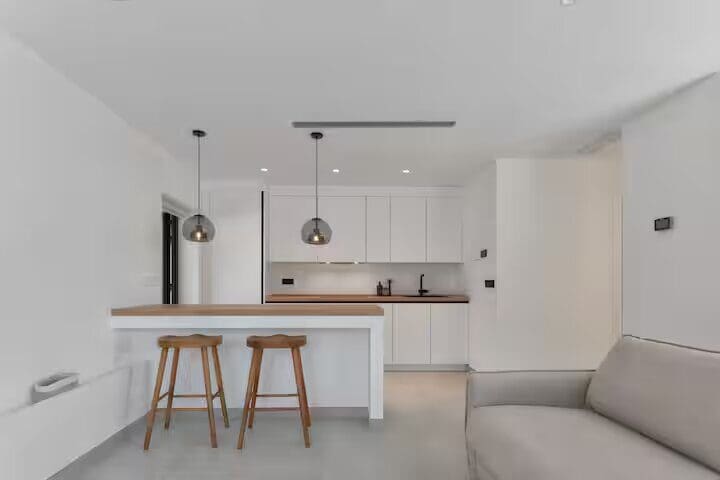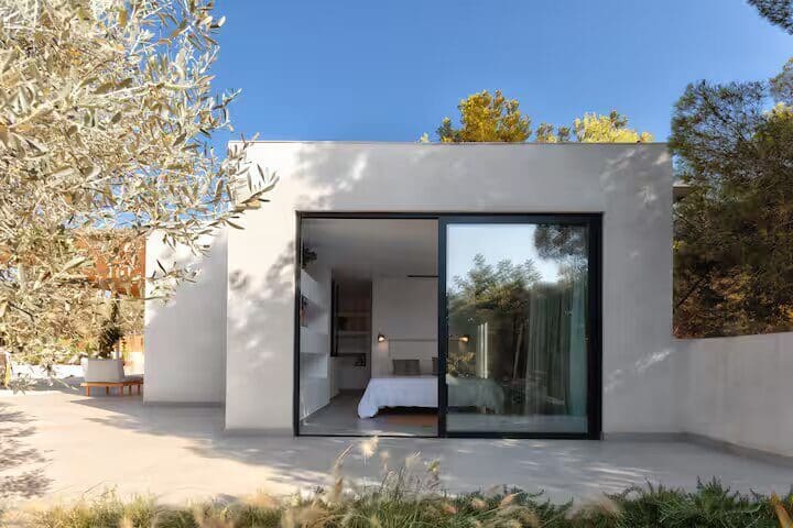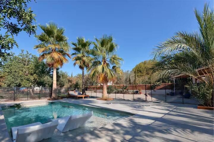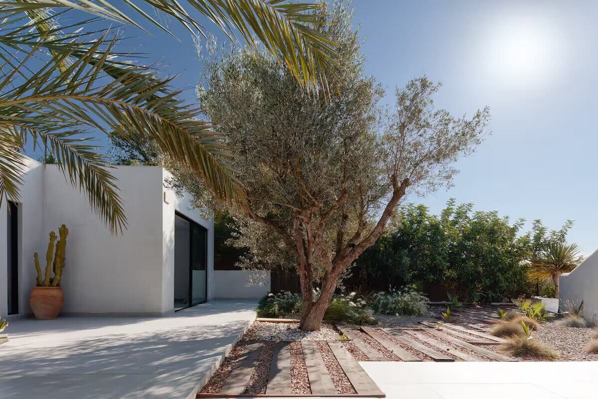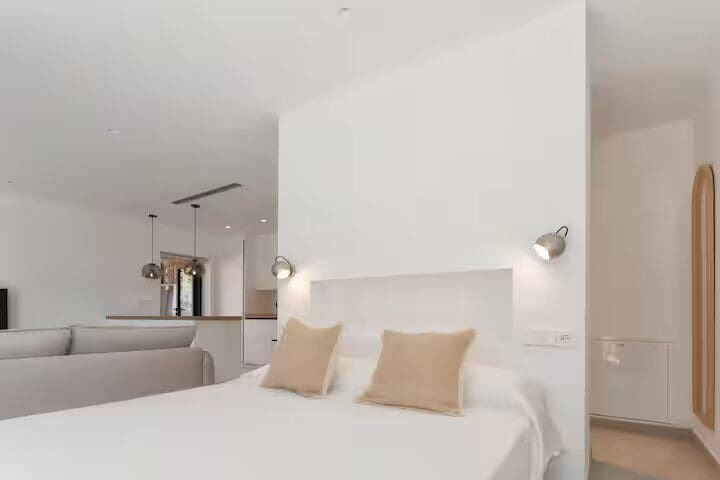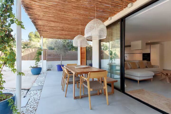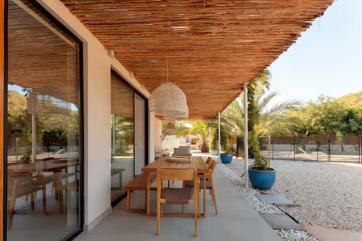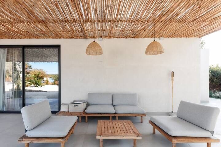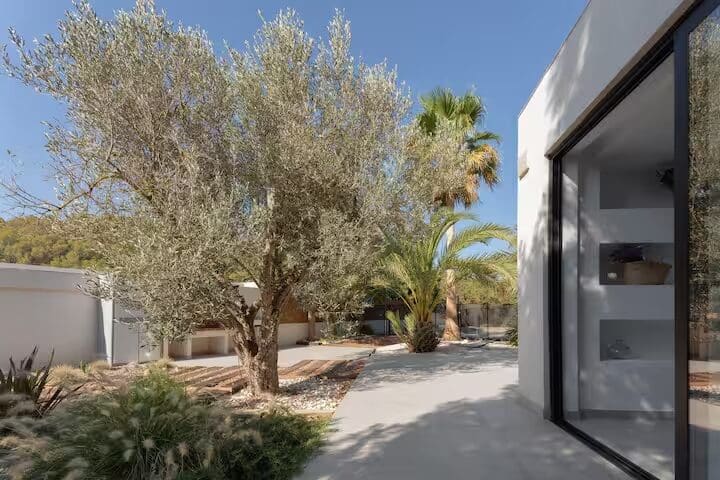 With an excellent location for accessing the best beaches on the southwest coast of the island, Can Romaní stands out for its minimalist design that combines simplicity and quality, featuring spacious and functional areas that seamlessly connect with the outdoors. Surrounded by lush Mediterranean vegetation, it is the ideal place for both adults and families looking to relax and enjoy the island’s natural beauty. The Space This beautiful 3-bedroom house, located just 5 km from Ibiza Town and 6 km from the picturesque village of Sant Josep, is the perfect retreat for those seeking a peaceful environment while staying close to the island’s most stunning beaches. Within a short drive, you’ll find gems like Sa Caleta (7 min), Cala Jondal (9 min), Ses Salines (11 min), and Platges de Comte (20 min). Additionally, the house is well connected to the airport (7 min) and Ibiza’s top clubs and beach clubs, including Cova Santa (4 min), Ushuaia (12 min), and Lío (15 min). Set in the heart of the countryside with panoramic mountain views, this home was recently renovated in 2024 to the highest quality standards, offering a perfect balance of serenity and modernity. With 160 square meters of interior space, the house features three bedrooms, all with direct access to the outdoors, ensuring comfort and accessibility for families or groups. Upon entering, you’ll be welcomed by a spacious and bright living room with a fireplace, decorated in a minimalist style. The open-plan kitchen features a sleek central island and is equipped with high-end integrated appliances, ensuring both functionality and aesthetics. A hallway bathed in natural light, thanks to vertical skylights offering views of the nearby ravine, leads to the bedrooms and bathrooms. These spaces have been designed with a minimalist approach, using high-quality materials and built-in shelves that pay homage to the island’s traditional architecture. Outside, the swimming pool takes center stage, surrounded by a lush Mediterranean garden with majestic palm trees, olive trees, and carob trees. Next to it, the barbecue area and outdoor lounge invite you to enjoy relaxing moments in great company. The entire house is equipped with air conditioning, underfloor heating and cooling, high-speed WiFi, and a 60'' TV. Amenities & Common Areas There is parking in front of the entrance, spacious enough to accommodate three large cars.