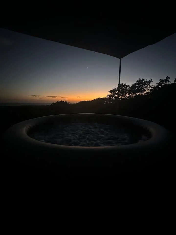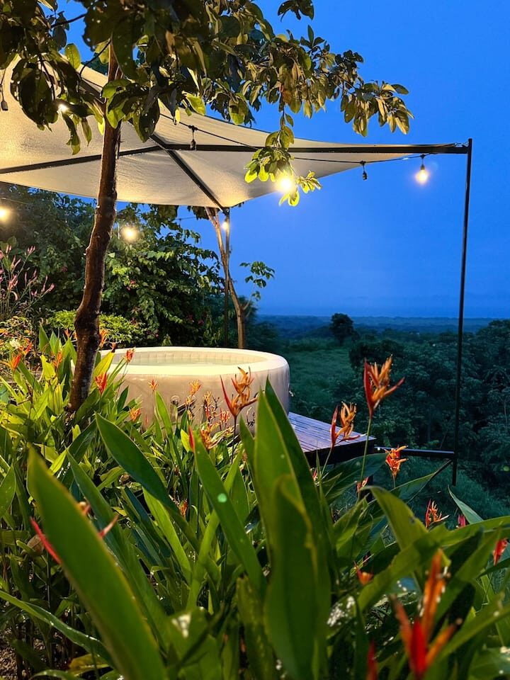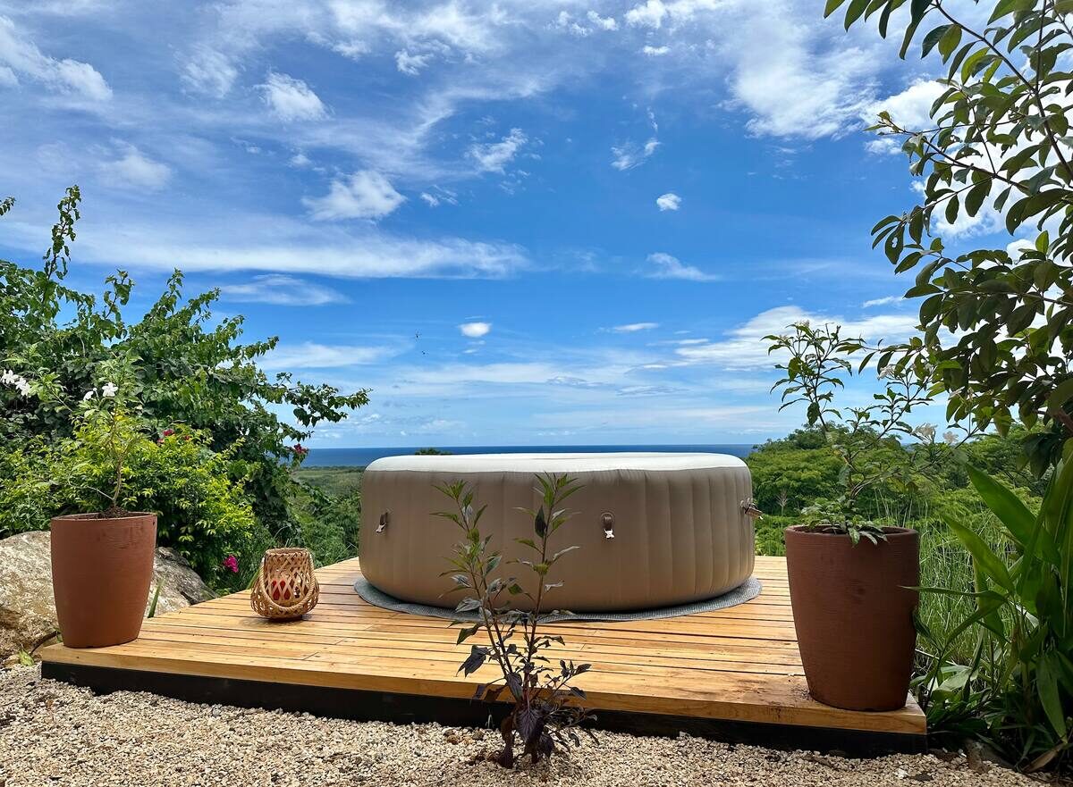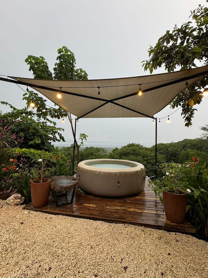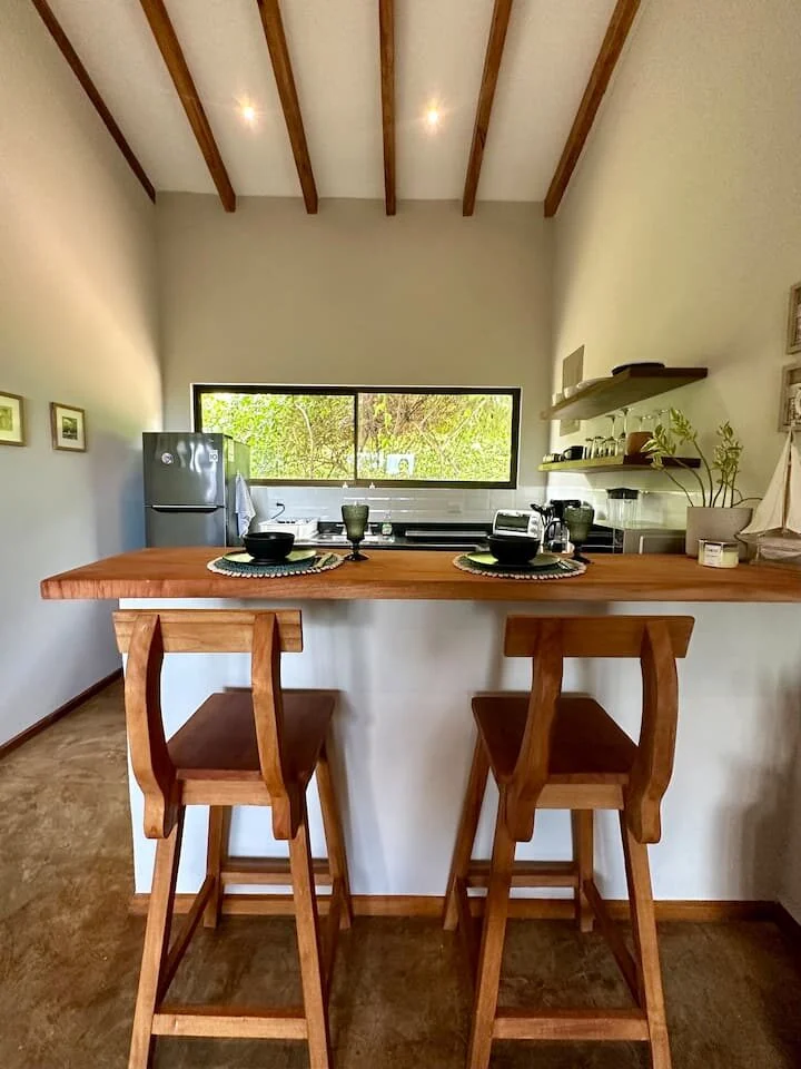 This 1 bedroom house has a spacious bathroom with a bathtub with a view. You can find everything you need to prepare a nice meal at our kitchen- living area, and after a surf session, hiking or mtb ride, you can chill at our jacuzzi appreciating the panoramic view. The house has a nice sofa with a 50″tv for a movie night. House for 2 people.