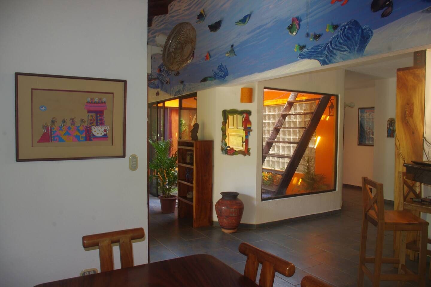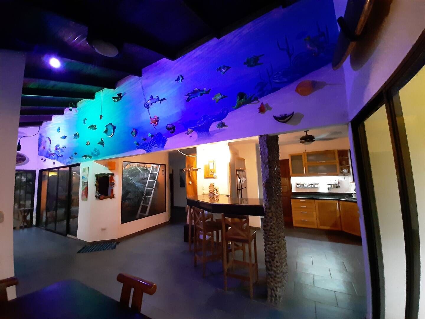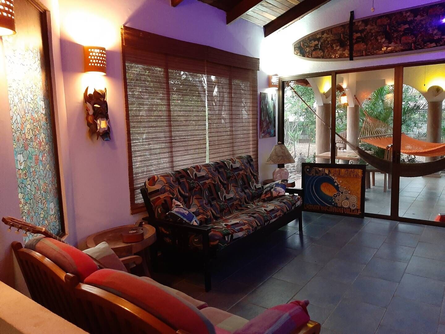 Casa Kalana is a unique contemporary home situated on one acre in the middle of one of the last pieces of untouched coastal jungle. Our main feature is our 40′ undersea 3D sculpture mural, beautiful original artwork and indigenous masks fashioned by the Boruca, Ngobe and BriBri Indians along with local Guaitil pottery. The heavily wooded property is home to monkeys, tropical birds, lush gardens and assorted wildlife. A surfers dream house with a three minute walk to one of the best breaks in all of Latin America! We have local telephone and WiFi available. We can organize all your special requirements such as a private chef, pre-stocked groceries, fresh free range chicken, pork and local fish. Fruits and vegetables from the Saturday market and the best fresh baked breads, horseback tours, zip-lines and so much more! Just ask!