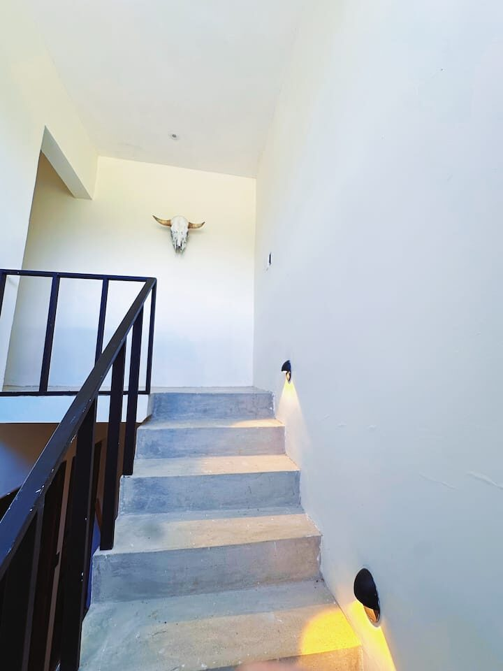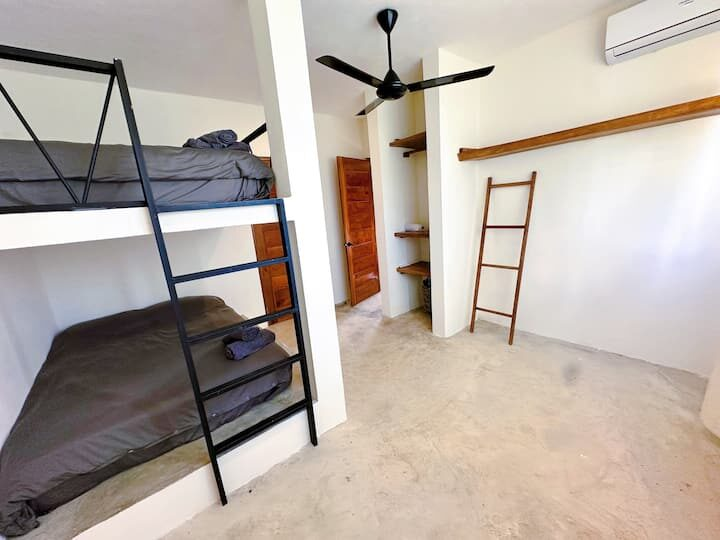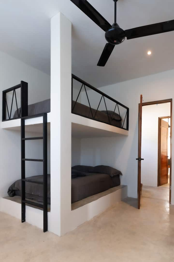 – Upper Floor: One bedroom with a queen bed, another room with an adult size (full size mattresses) bunk bed that can accommodate up to 4 children, 1 shared bathroom, and a small terrace.