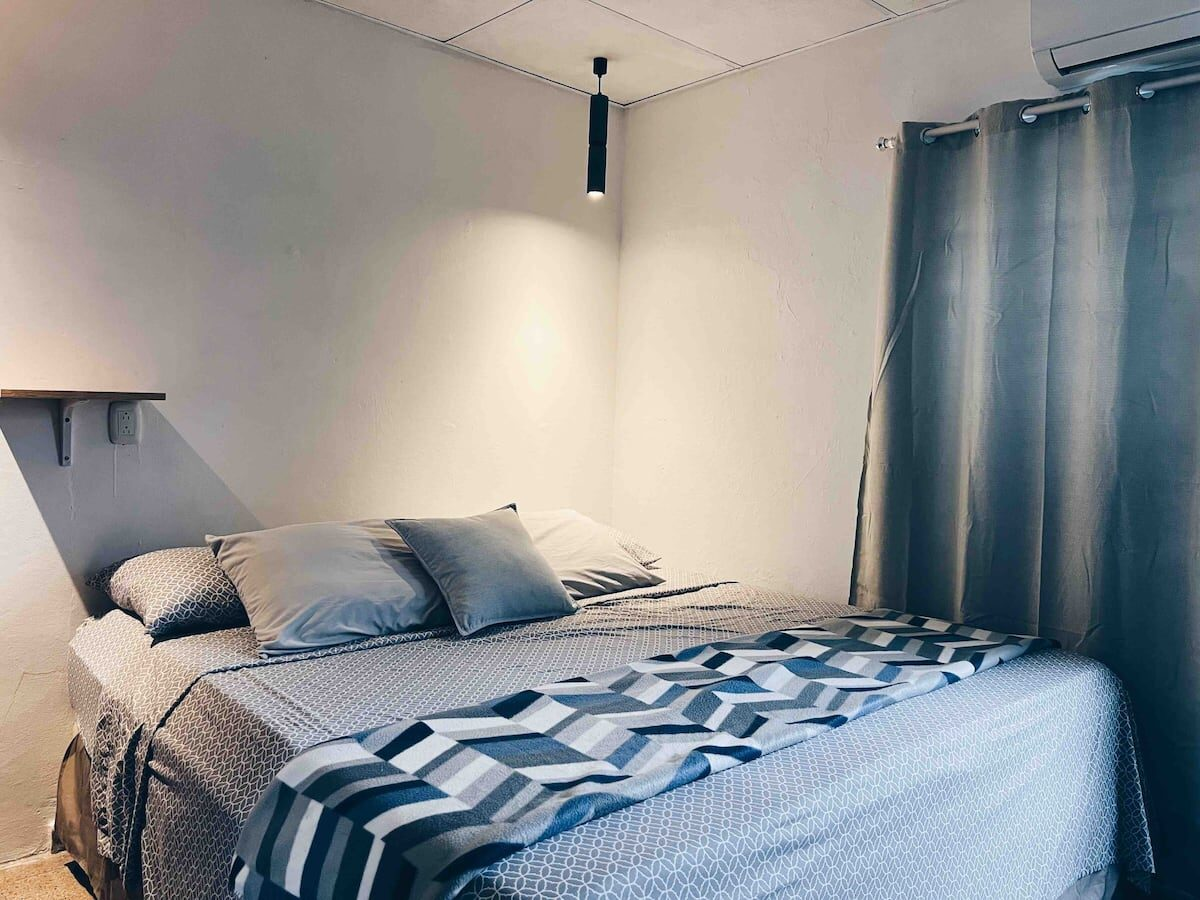 Private loft style apartment with open spaces, with a room that has a closet for storage, 50”TV, desk with an ergonomic chair and a comfortable king size bed for your full rest.