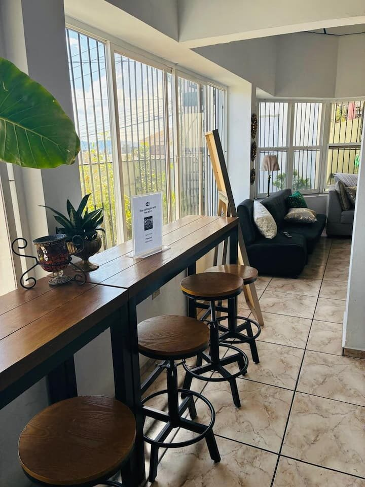 Stay at a beautiful villa with your friends, family or group in this practical and elegant Ensuite Master Bedroom with 5 beds, a smart TV, walk in closet and bathroom. It has a bonus mini room with a bed. Enjoy your stay at a villa that has a fully equipped kitchen and Sala, dinning room and plenty of space to work, relax, eat and play.