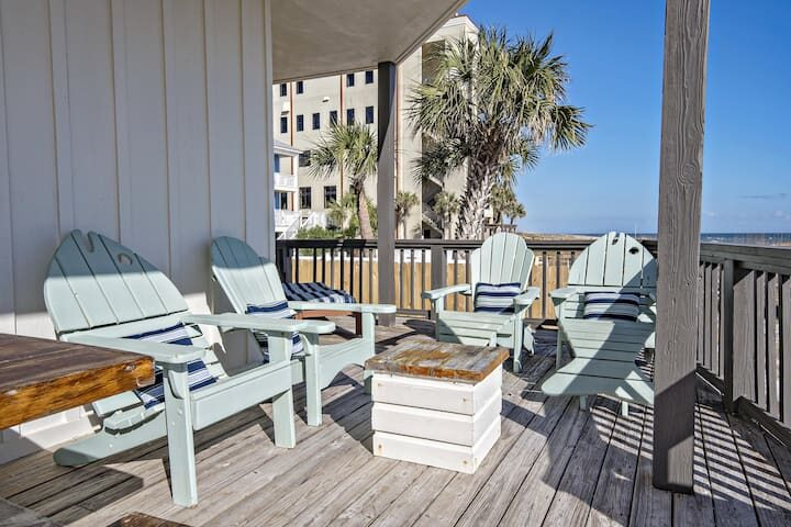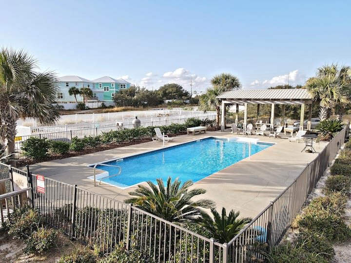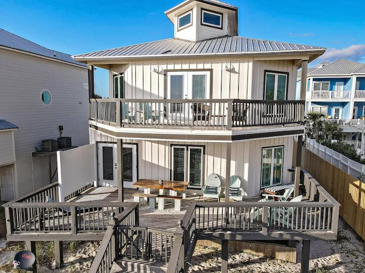 Two large decks overlooking the Gulf of Mexico’s blue waters and white sands