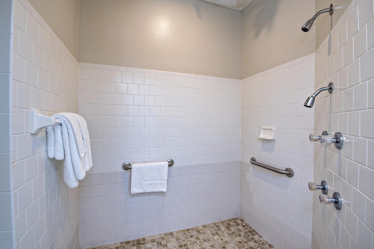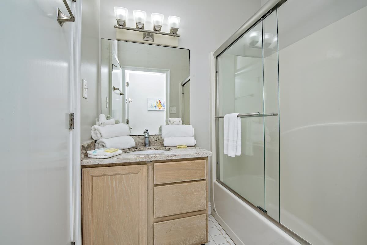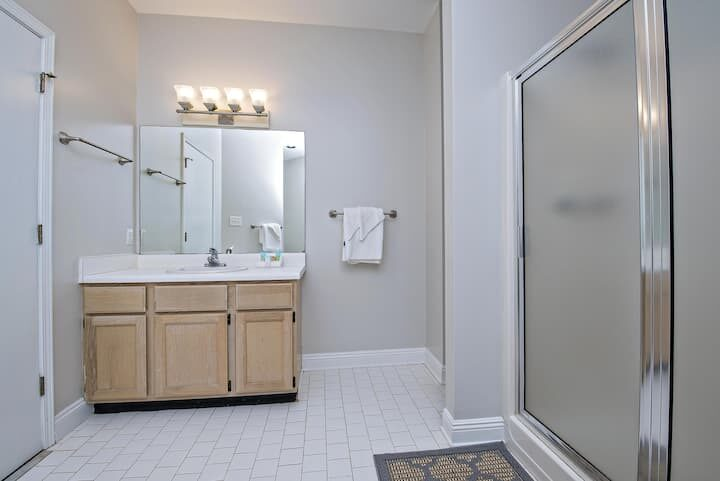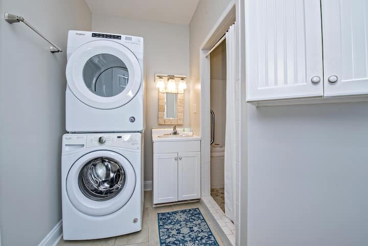 Additional full bath on main floor with an oversized shower—great for showering all the kiddos after the beach (you can even throw their bathing suits right in the front-loading washer beside the shower!)