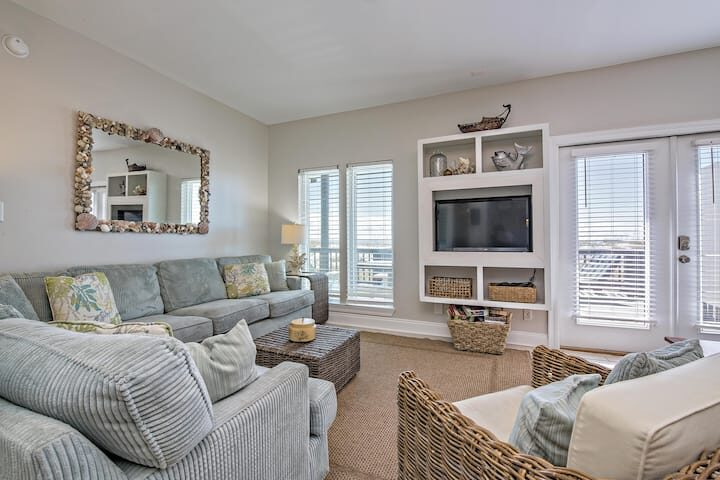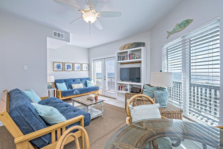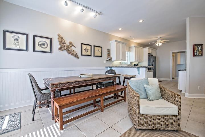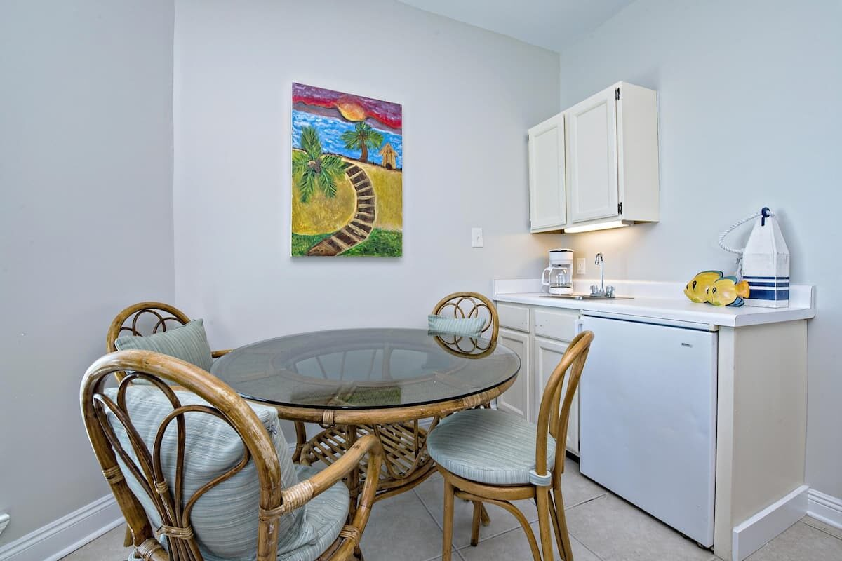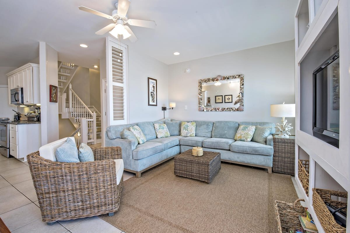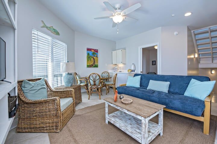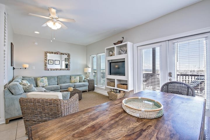 The main-floor living area features a plush, sectional sofa and armchair in front of a flat-screen TV. In the heat of the day, relax in the cool blast of the A/C and read a good book (or sneak an afternoon nap). Adjacent, a dining table seats 6-8—a great spot for both family feasts and boardgame nights. Glass doors open out onto the deck, so you can easily step out for some sun and Gulf views! The second living area, located upstairs, features two futons, an armchair, a dining table for 4, and a mini-fridge you can stock with your favorite cold drinks.