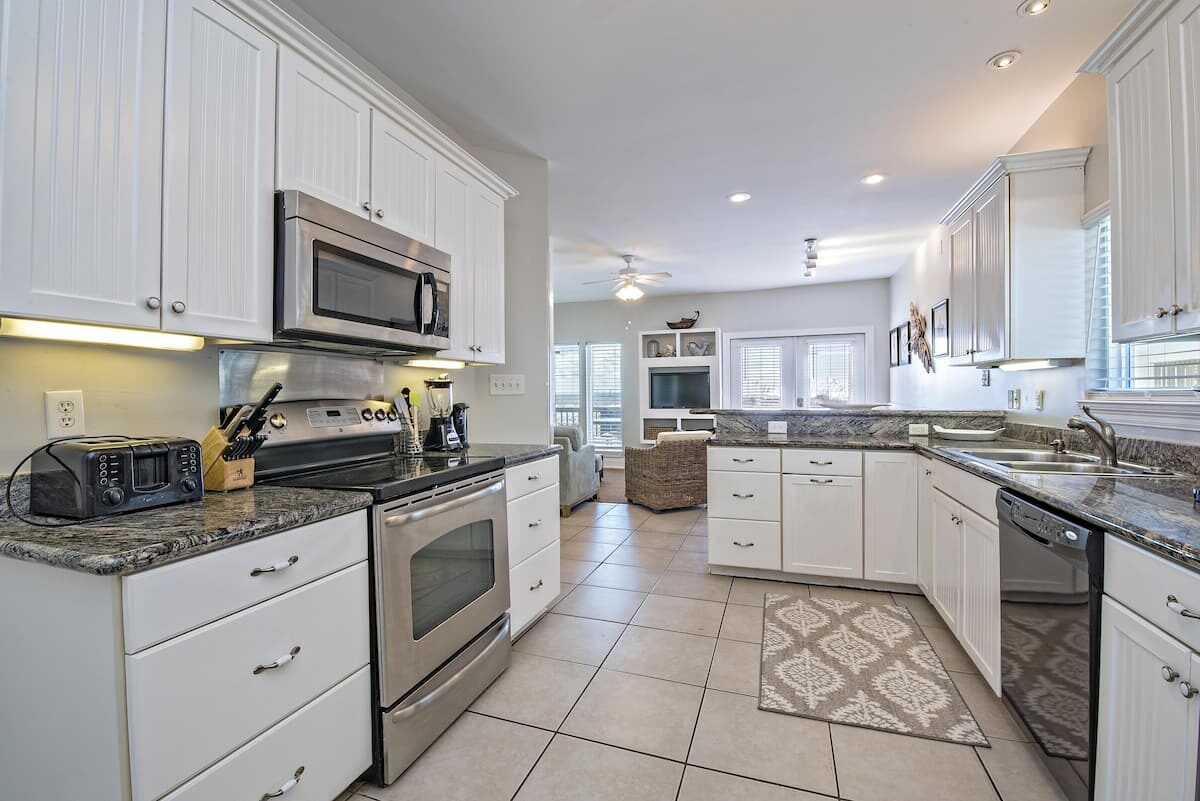 A fully equipped and stocked kitchen is ready to help when the crew gets hungry. Stock the double-sided fridge with ingredients from one of the nearby grocery stores, and make use of the appliances, large and small (including stove, dishwasher, Keurig, blender and toaster). There is plenty of counter space for multiple chefs to work together on dinner, including a breakfast bar with two barstools.