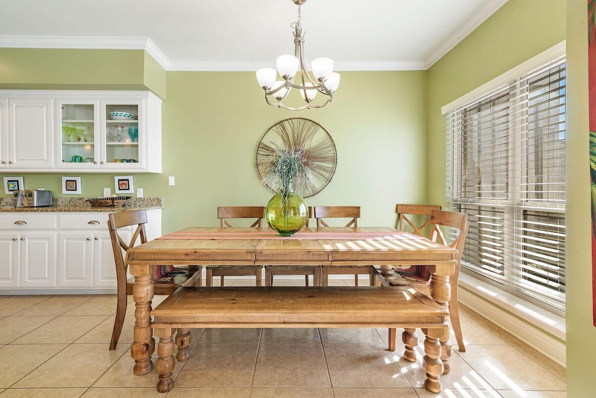The dining area features an 8-person dining table—perfect for your group feasts. The adjacent kitchen island with 5 barstools makes for a great “kids’ table.” And don’t forget the picnic table underneath the house on the patio!