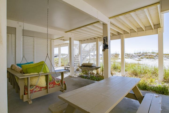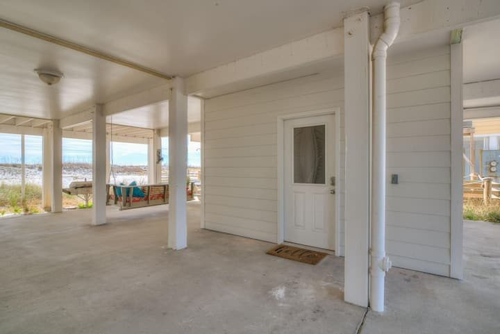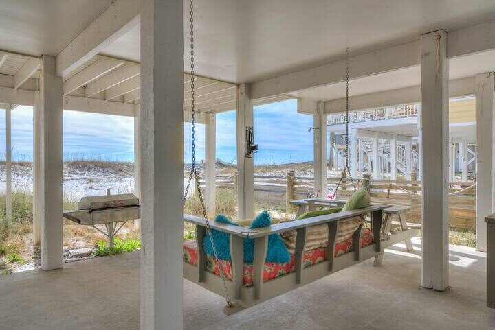 Outside, the ground-level covered patio is equipped with a picnic table and porch swing to enjoy the sea breeze while staying shaded from the sun. Here, you can also rinse off all the salt and sand in the freshwater outdoor shower. The big, sparkling pool is steps away and is only shared with the neighboring property, Heavenly Sunrise.