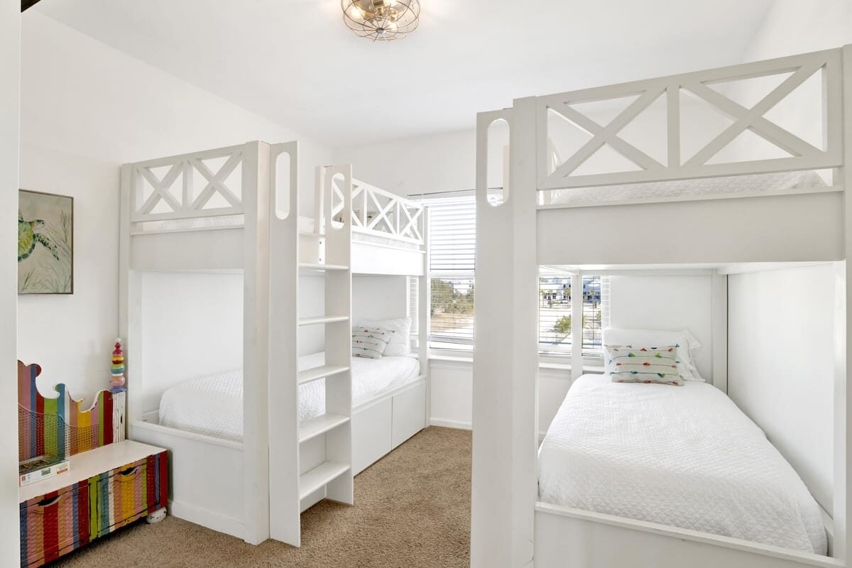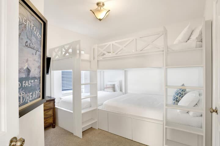One bedroom on this floor has new custom bunks featuring queen over queen bunks and a twin XL over twin XL bunk (sleeps 6). Another offers two twin XL over twin XL custom-built bunk beds (sleeps 4). The custom twin bunks will accommodate children or adults with the twin XL mattresses. These two bedrooms share a full-sized bathroom. Both sets of custom bunks were added in Winter 2022.
