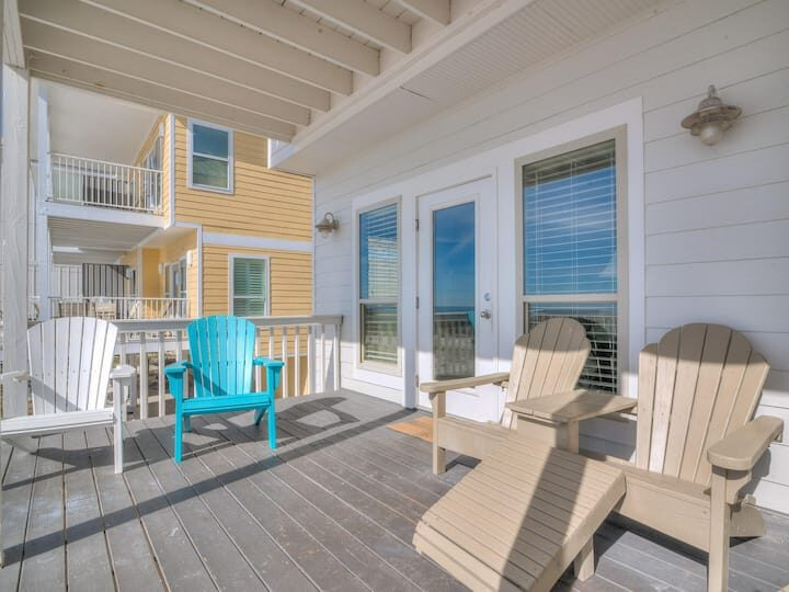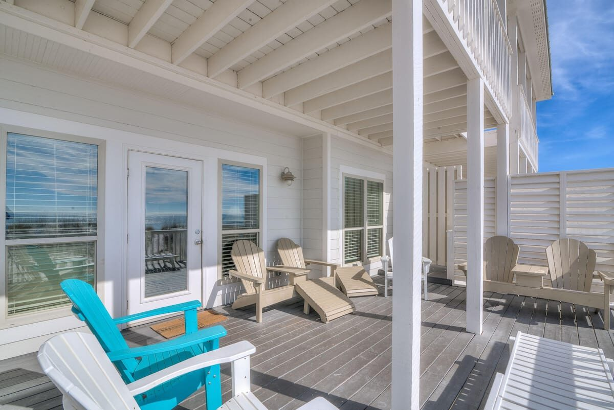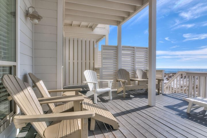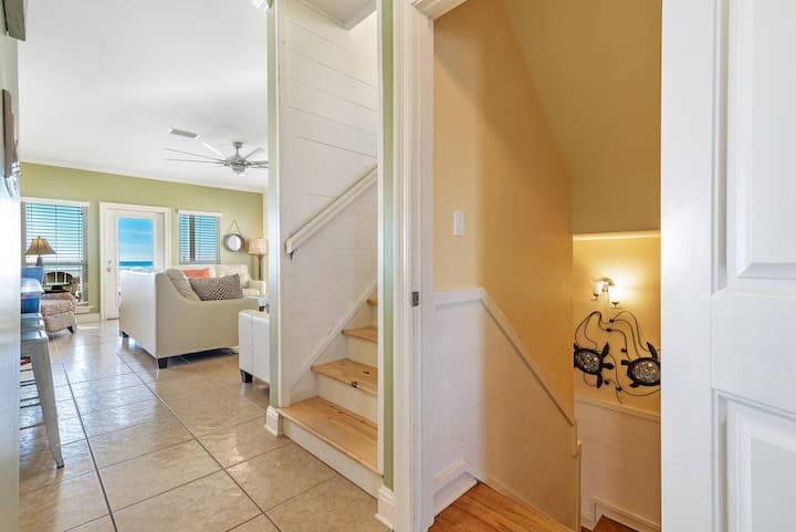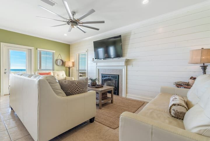 The first floor features a roomy living area with a flat-screen TV, nap-worthy sofas, and windows that fill the space with natural light. There is room here for everyone to lounge together in the A/C after a day at the beach! From here, access a covered, private balcony overlooking the Gulf and beach from comfy Adirondack chairs.