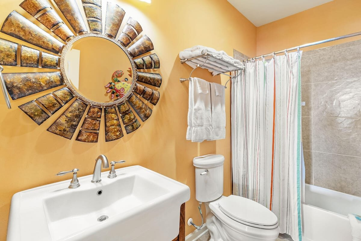 The first-floor bedroom has a king-sized bed and a bathroom with a tub/shower combo.