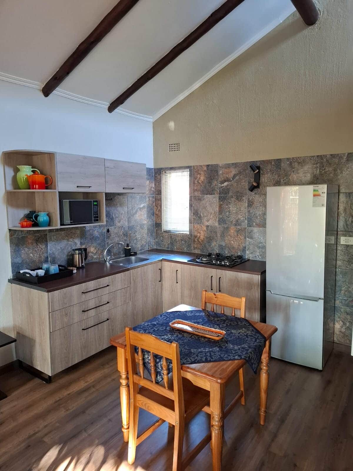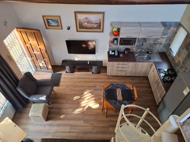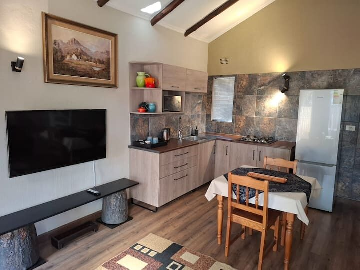 Attached to the main homestead, with its own entrance and a private garden. The garden and patio offer a green space to enjoy your morning beverage, an afternoon relax, and an evening braai/barbeque.