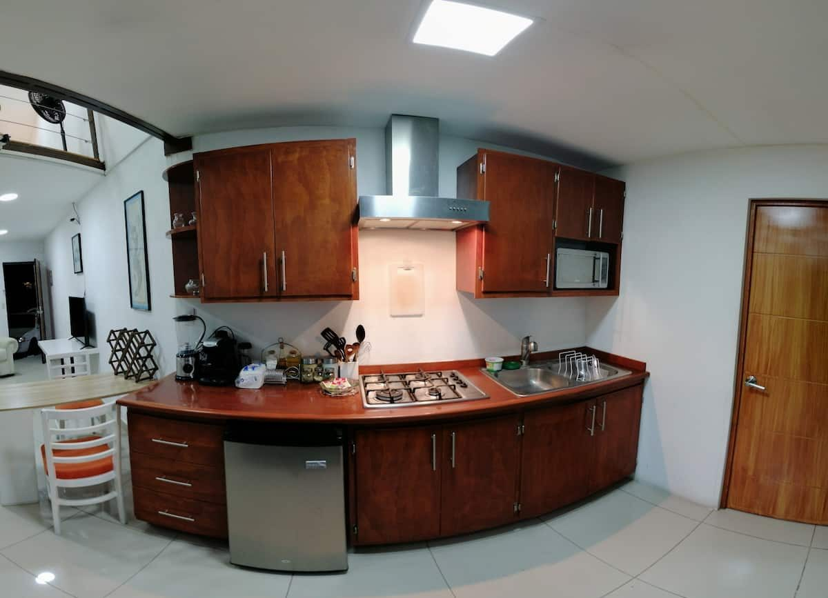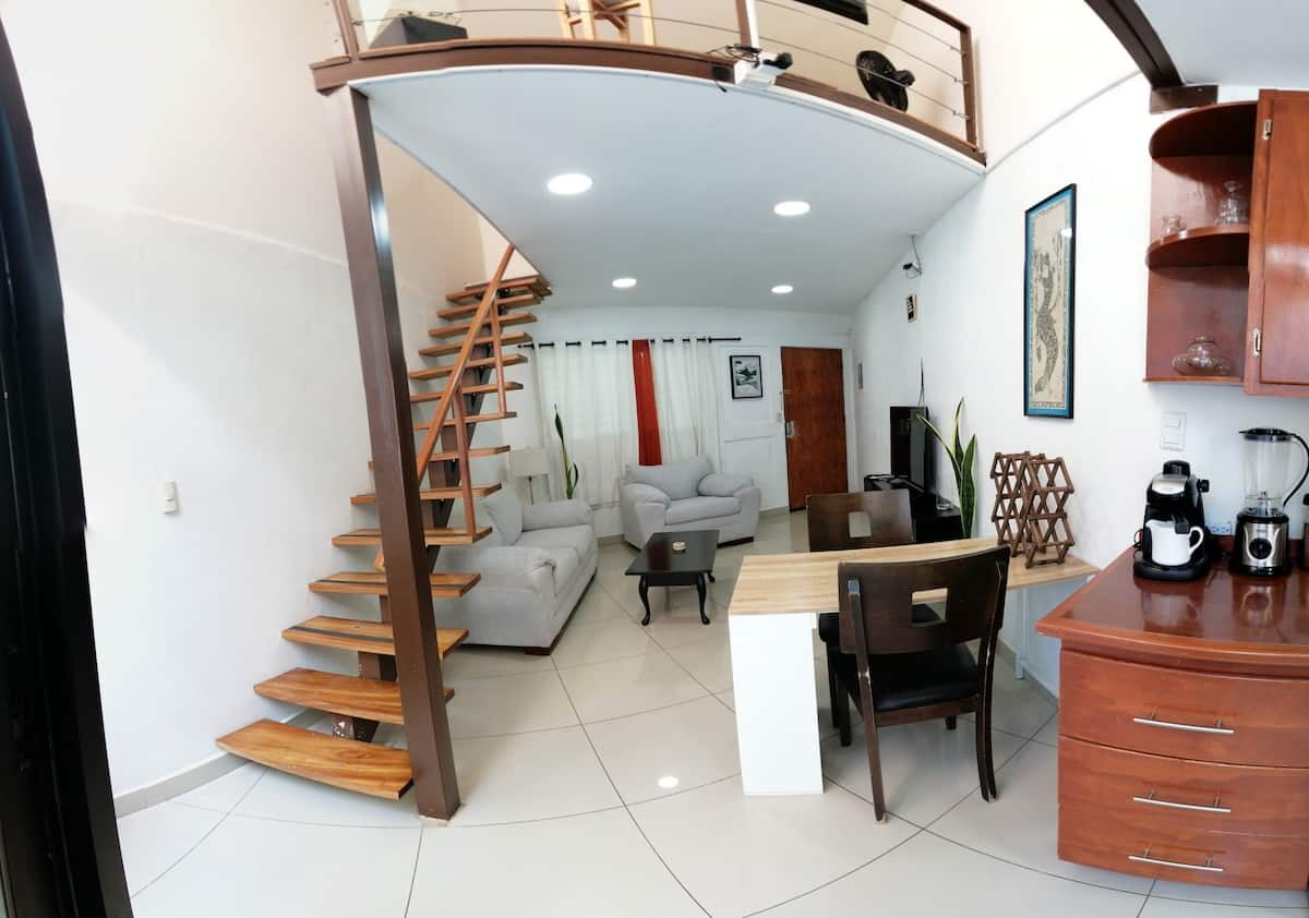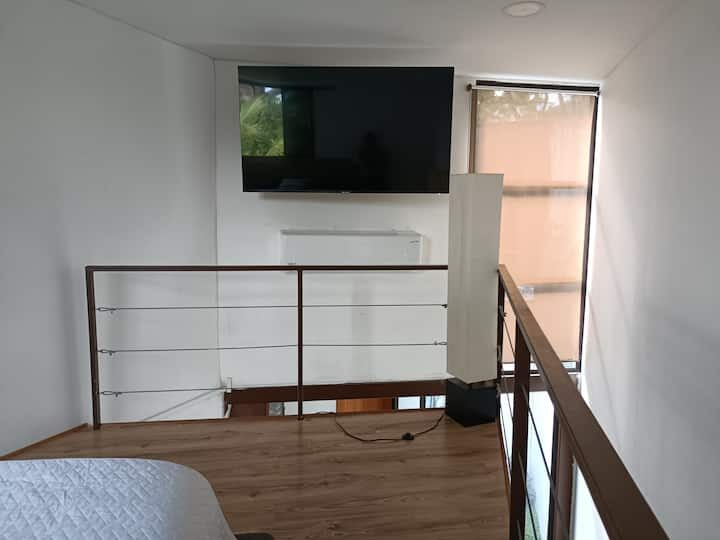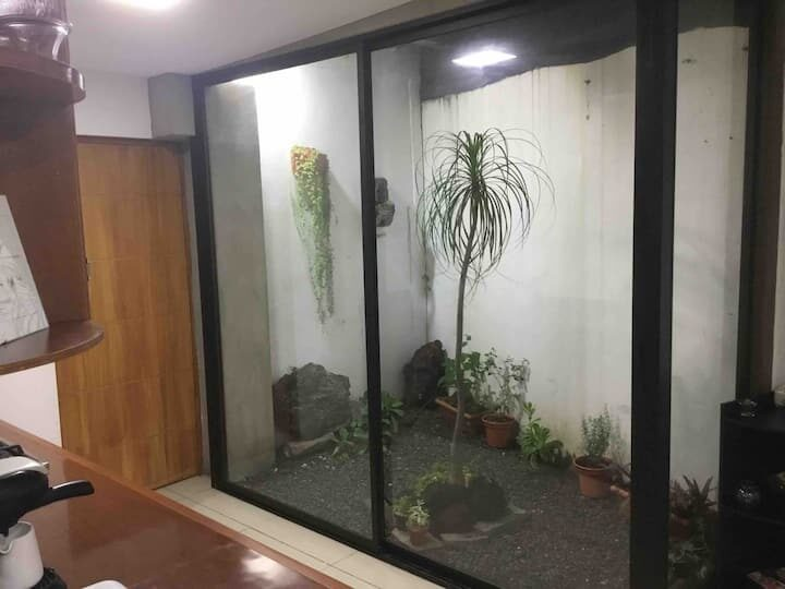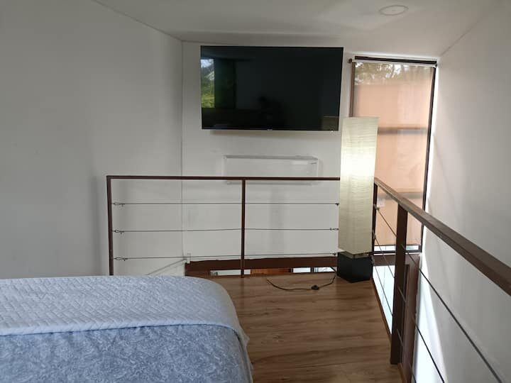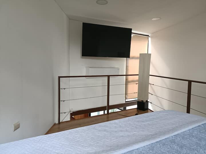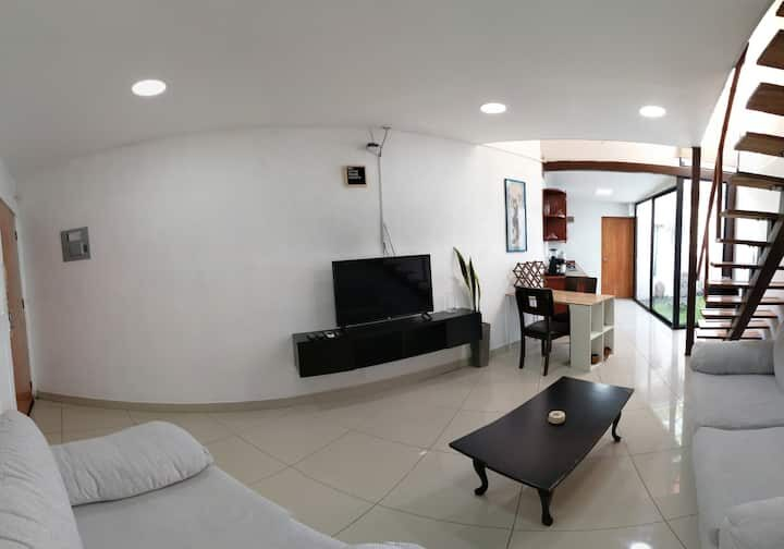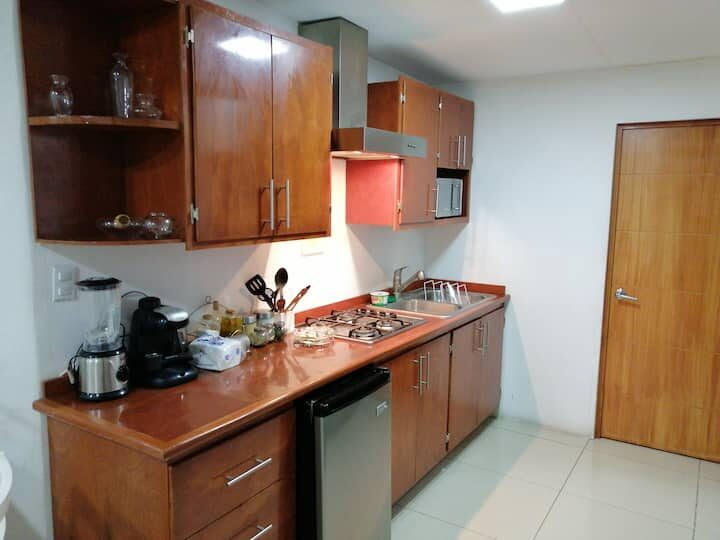 Loft like apartment very clean, open, light, minimalist and cosy, in a secure area near by malls and restaurants with access to important avenues of the citiy. Full equipped with kitchen and accessories, living room, comfy king size bed, closet, work area with a desk and a full laundry area with dryer and washing.