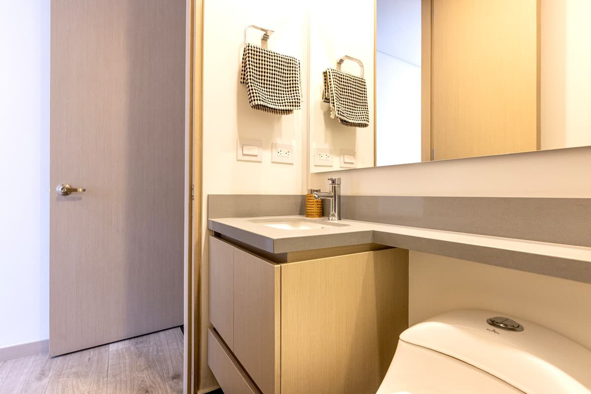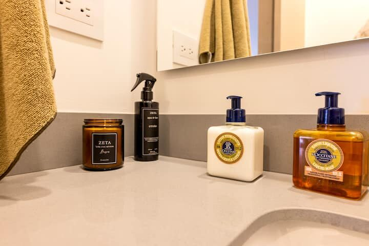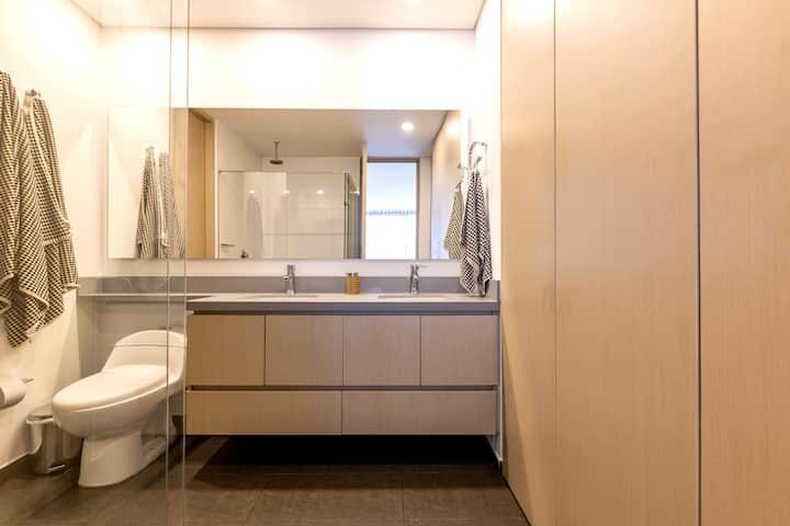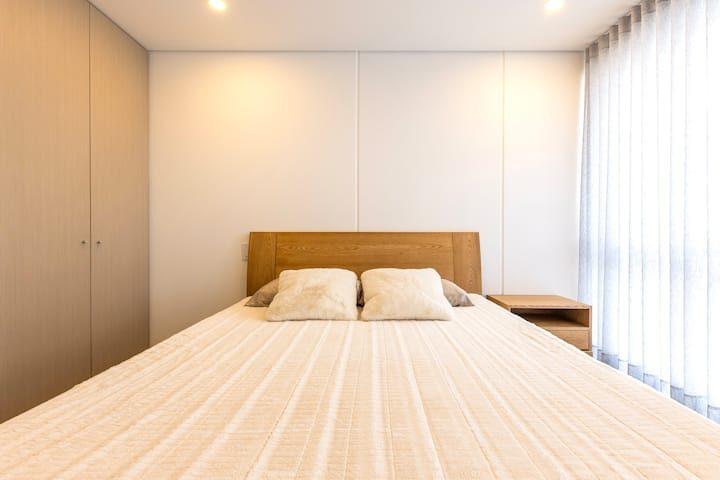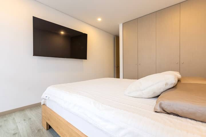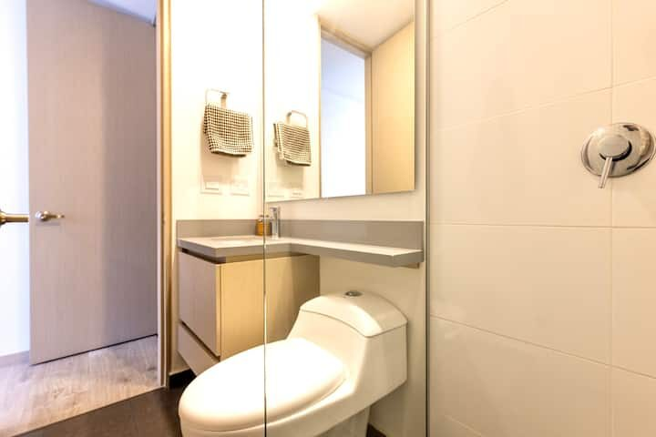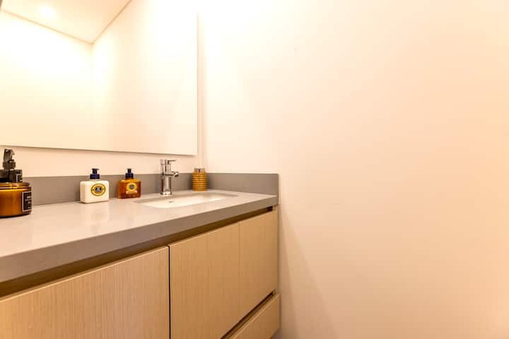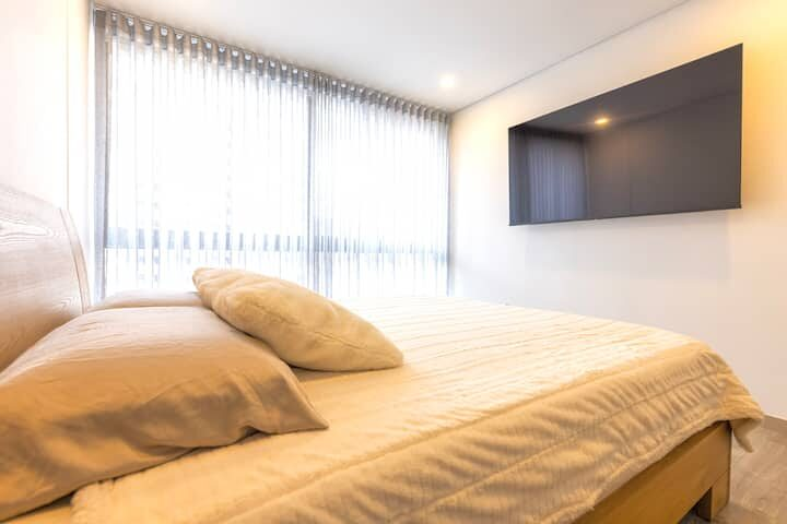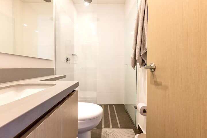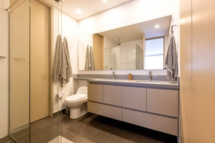 The master bedroom features a king-sized bed, black-out curtains, spacious closet, private bathroom with shower, two sinks and a wonderful mirror with great illumination, a smart TV and a wide window to the city mountains. Just in front, you will find a private studio with a functional desk to work from home.