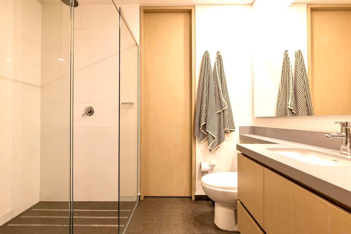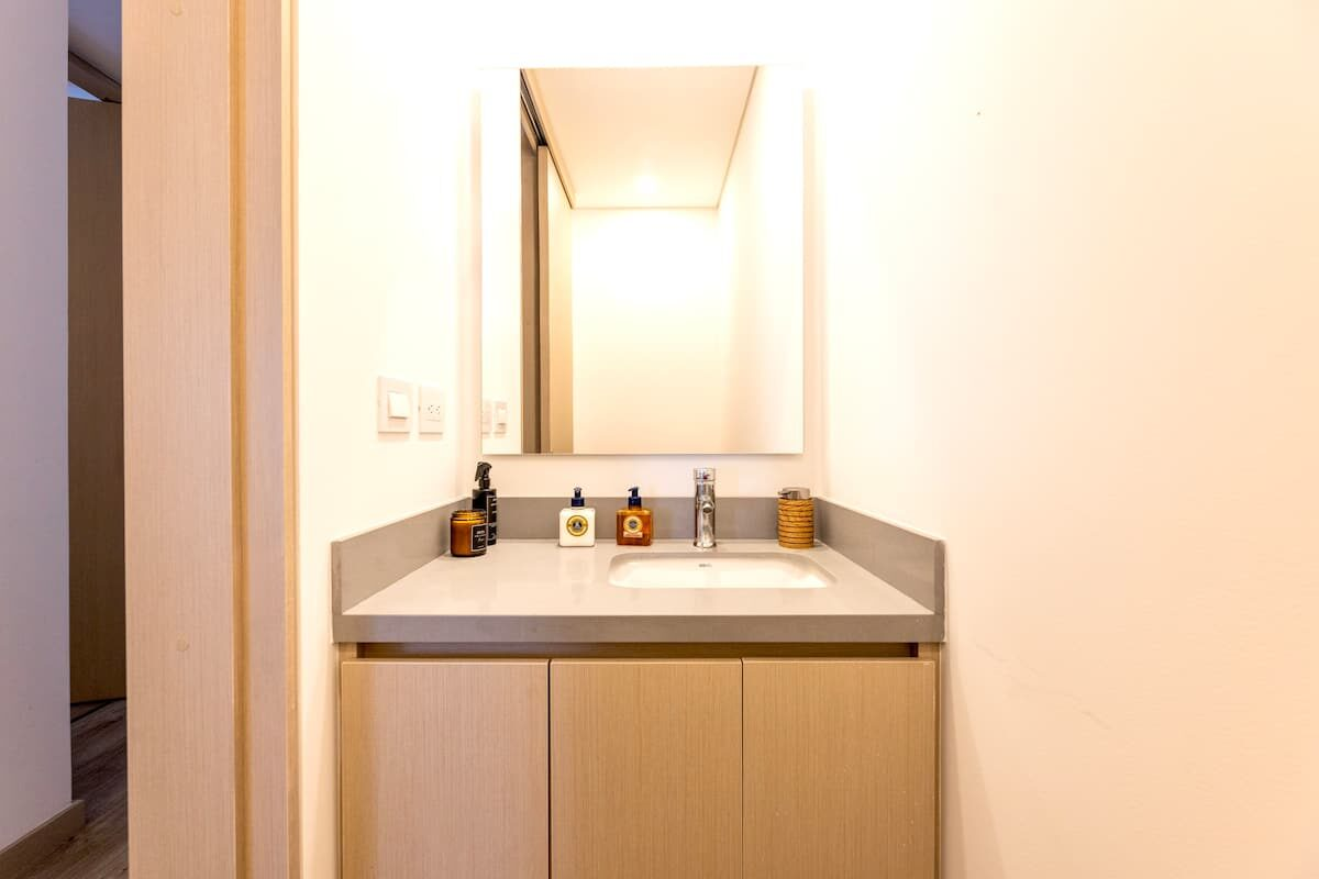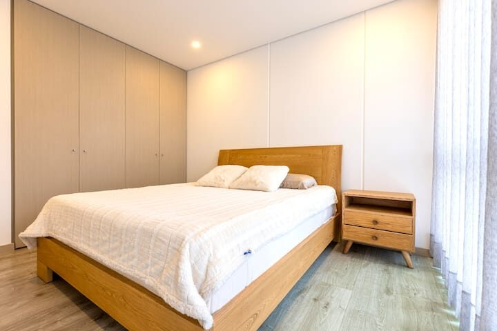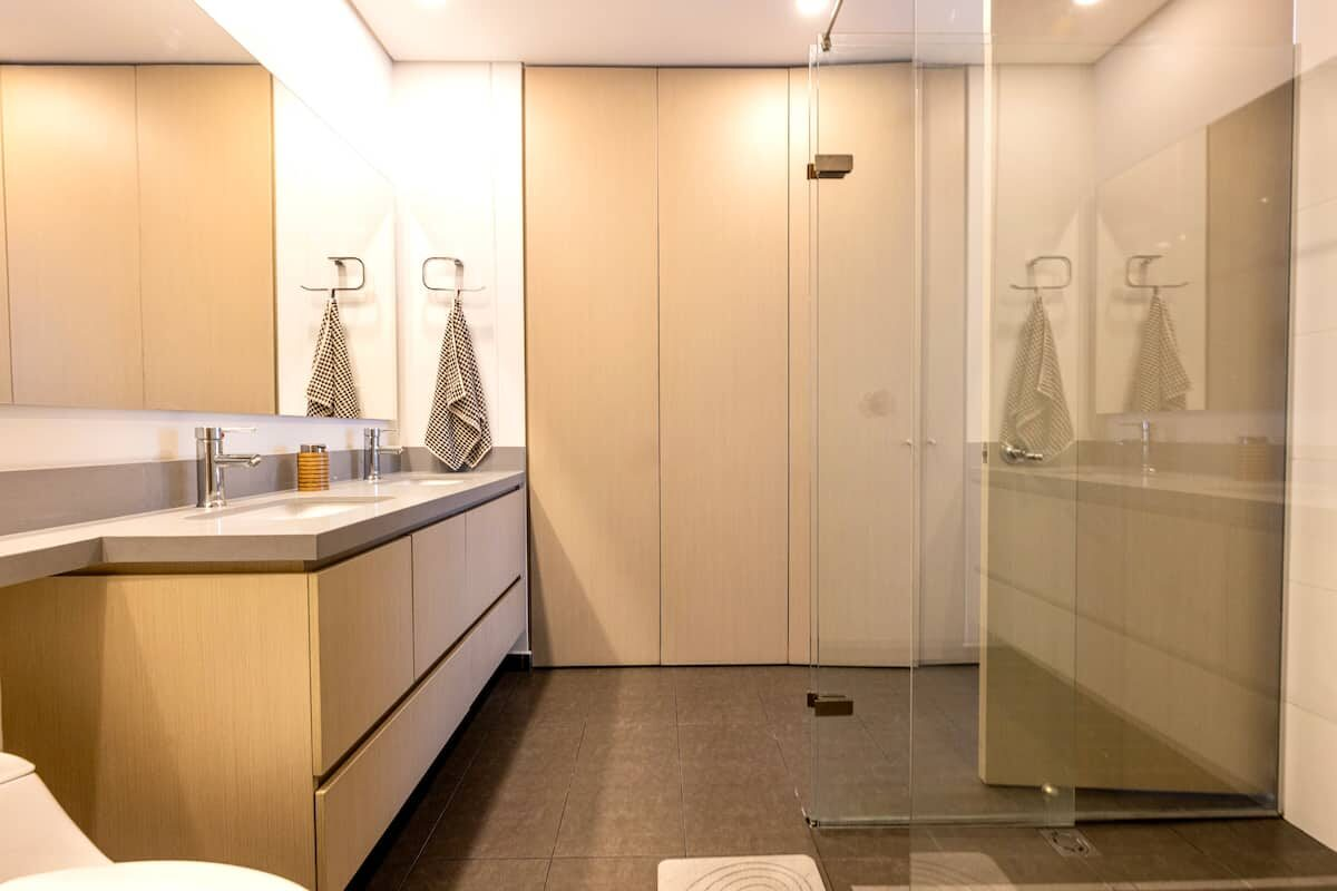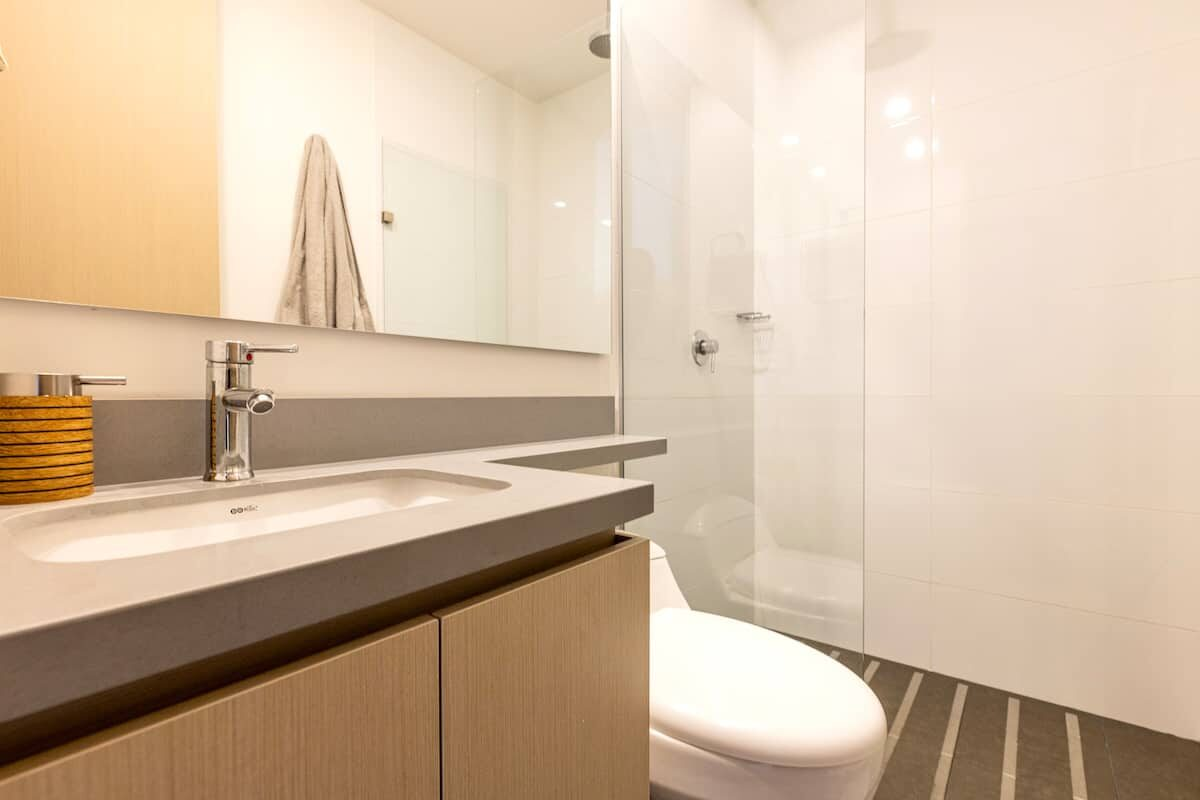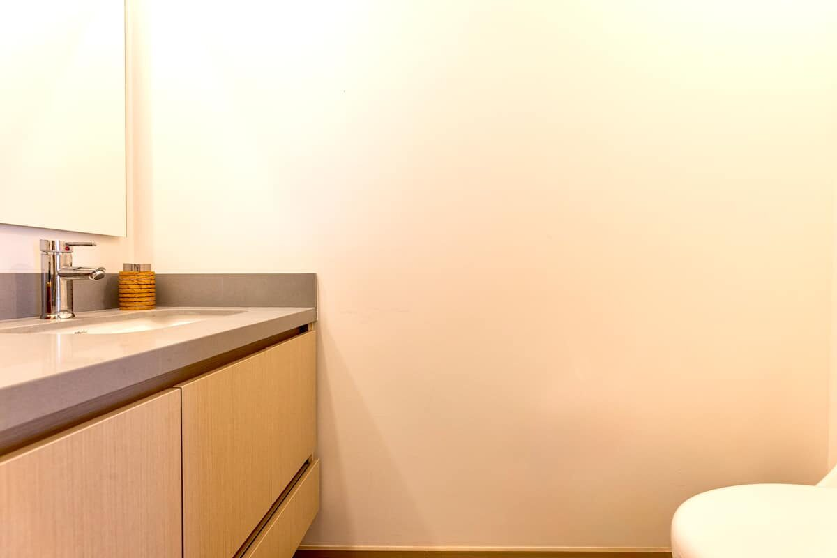 The master bedroom features a king-sized bed, black-out curtains, spacious closet, private bathroom with shower, two sinks and a wonderful mirror with great illumination, a smart TV and a wide window to the city mountains. Just in front, you will find a private studio with a functional desk to work from home.