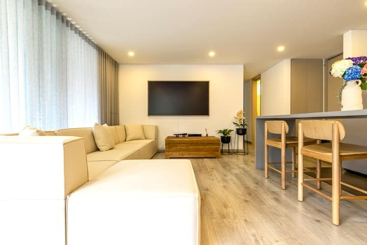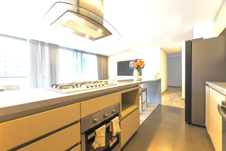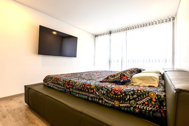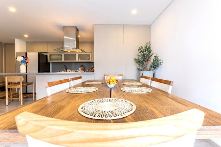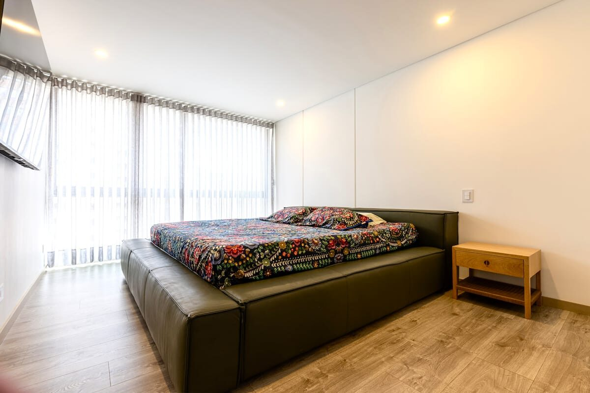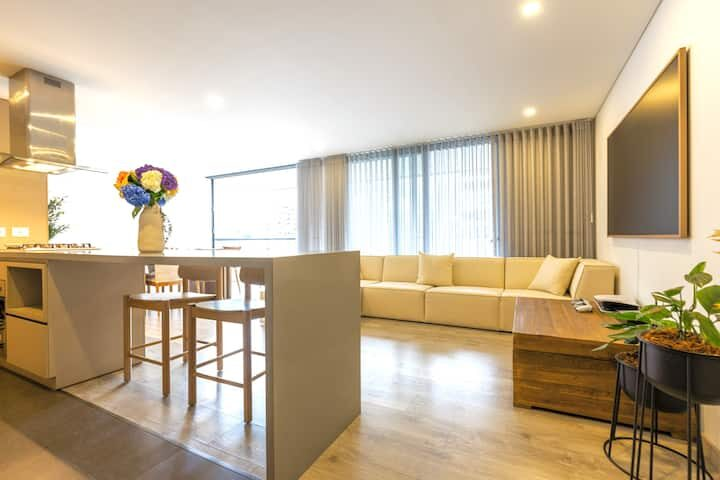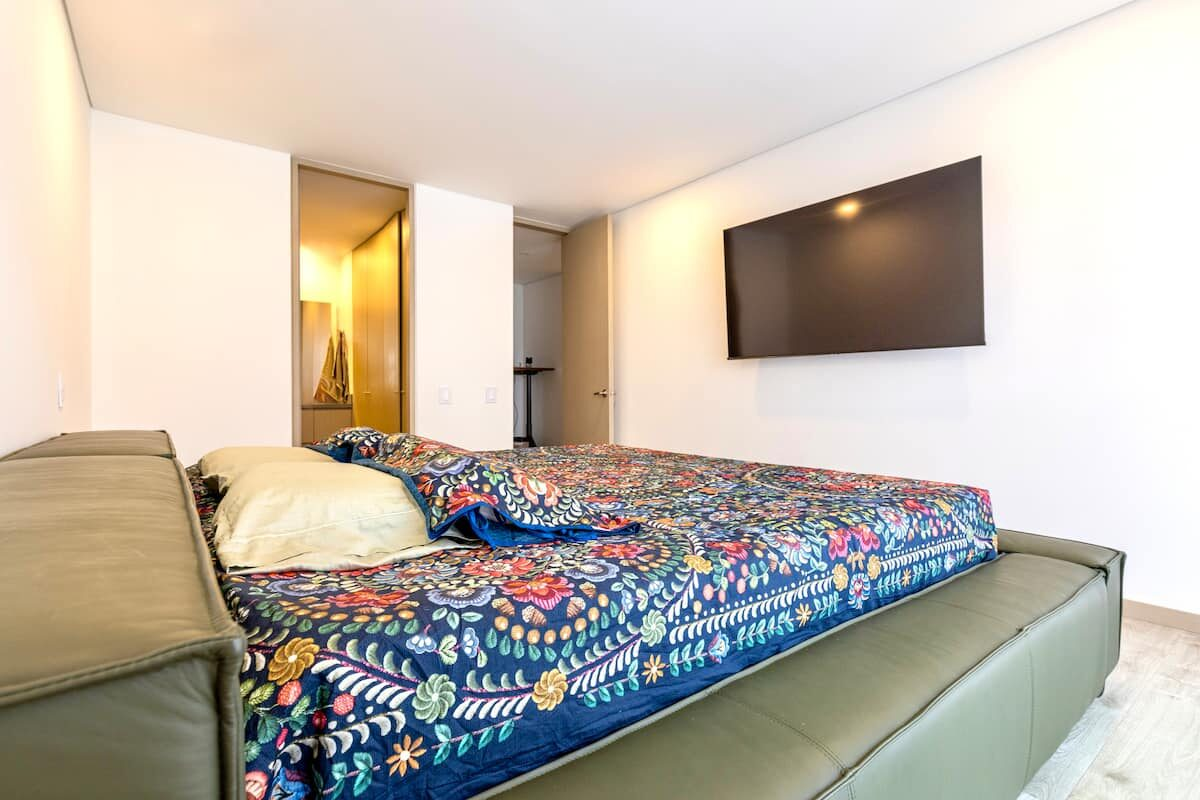 Is a brand new spacious apartment, full of design, art, and life, with 2 large bedrooms, a studio, and 3 bathrooms. The first space features a wide and bright living room with high ceiling, modern furniture, unique local art pieces, open and fully equipped kitchen, a practical laundry area, a guest bathroom, and a large balcony with sun and soundproofed doors and beautiful views over the mountains of Medellin.