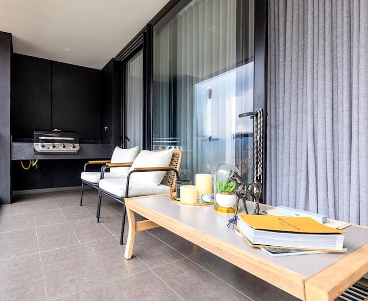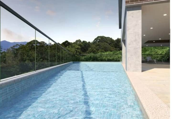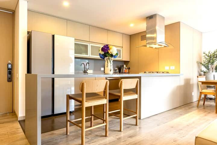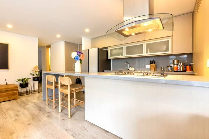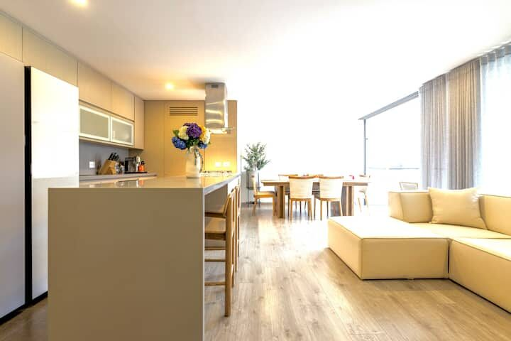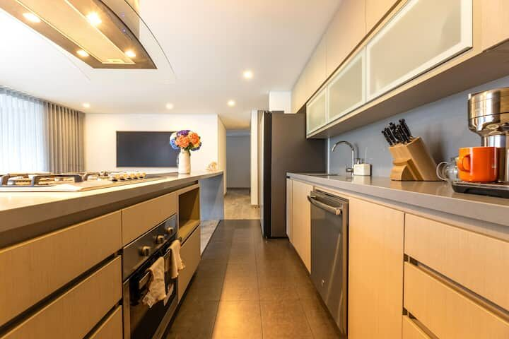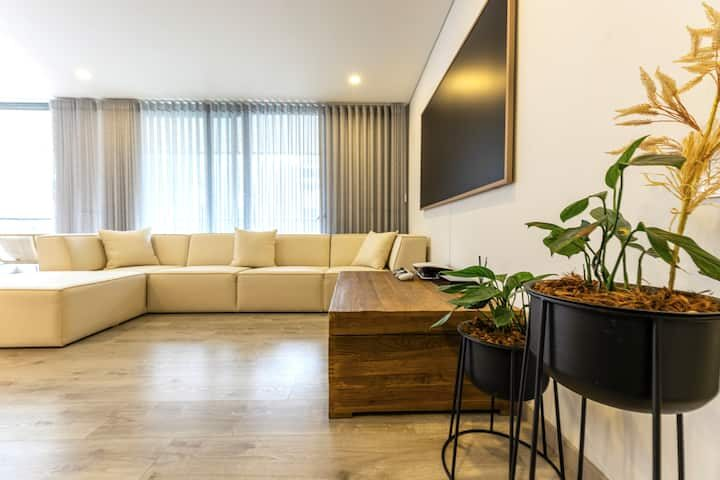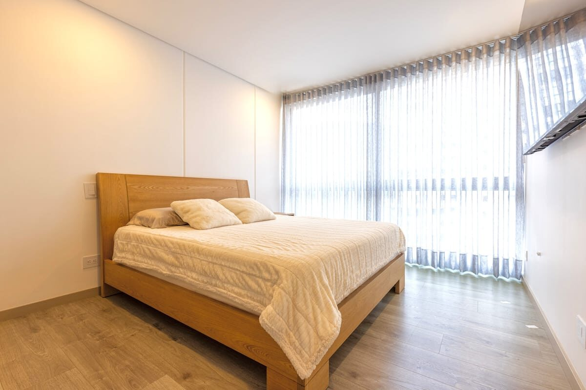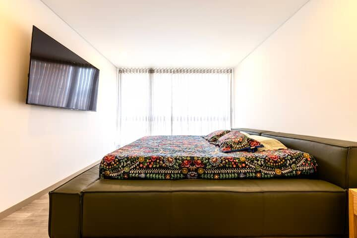 Is a brand new spacious apartment, full of design, art, and life, with 2 large bedrooms, a studio, and 3 bathrooms. The first space features a wide and bright living room with high ceiling, modern furniture, unique local art pieces, open and fully equipped kitchen, a practical laundry area, a guest bathroom, and a large balcony with sun and soundproofed doors and beautiful views over the mountains of Medellin.