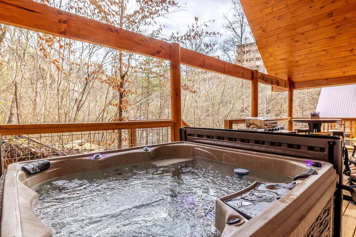 The outdoor lounge spaces and expansive balconies completely surround you with the beauty of the Smoky Mountains. Slide open the sliding glass doors from the living room and step out onto the huge deck. This covered space has a brand new hot tub, stainless steel grill, high-top dining area, and comfortable rocking chairs. Enjoy your coffee out here with a view, or fire up the grill and serve a family-style dinner with the wilderness as a backdrop.