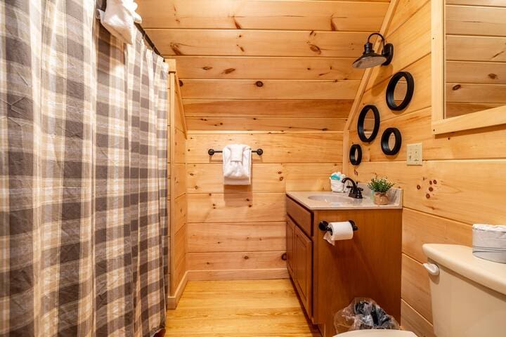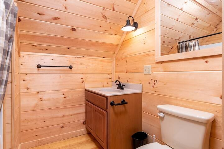 The second bedroom on the main floor also boasts a rustic charm that fits right in with the wilderness outside, and a private bathroom with a tub/shower combo.