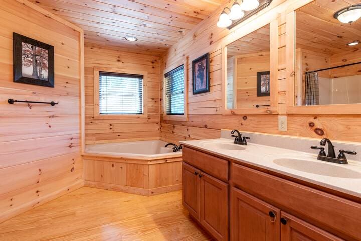 This spacious Smoky Mountain retreat has four private bedrooms, all of which have ultra-comfortable King size beds, smart TVs, and en-suite bathrooms. The main level master bedroom features a 4K smart TV, a spacious closet, large windows, and a private bathroom with a large Jacuzzi tub.