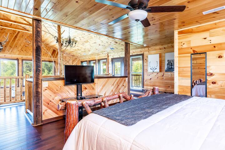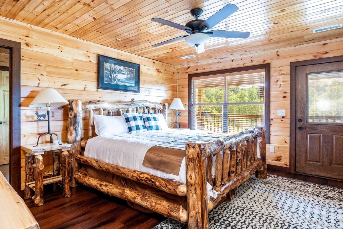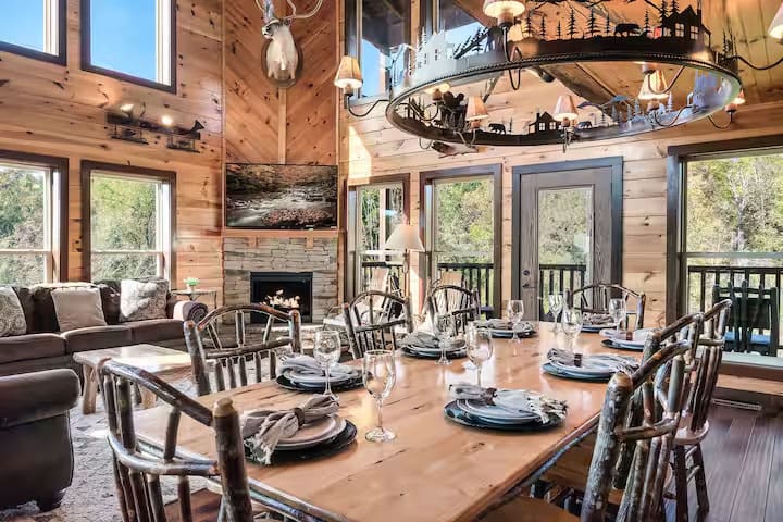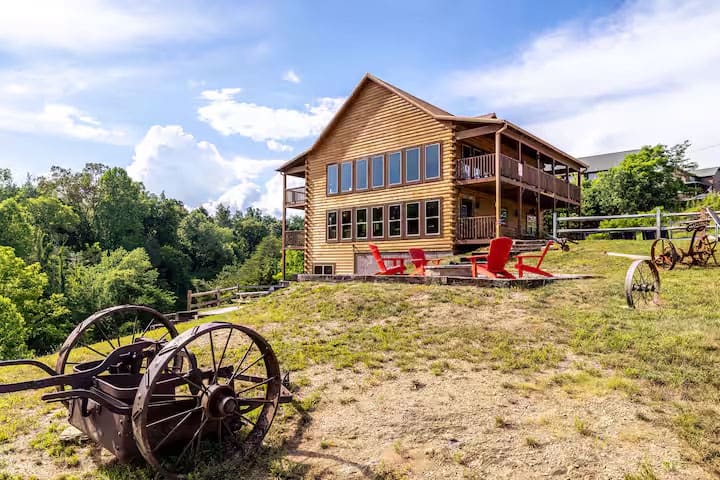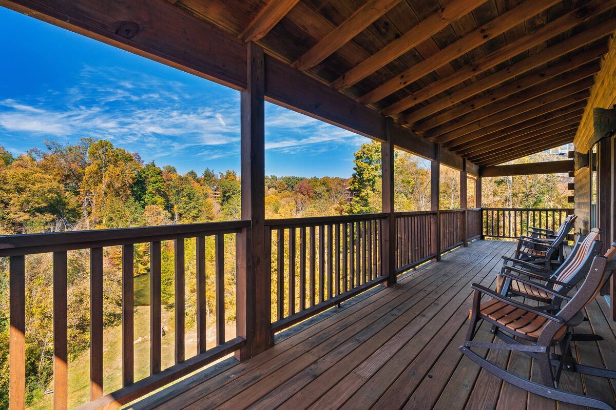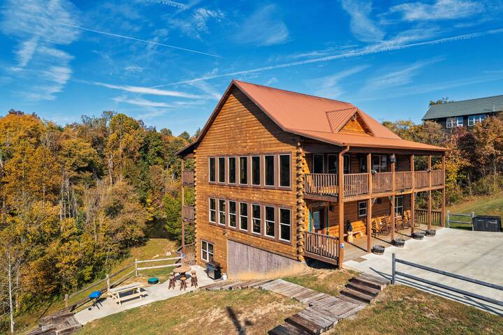 This exquisite cabin is the perfect getaway for large families or groups of friends! Sitting on 2 acres, the 4000 sq. ft. home boasts a private lake, 5 bedrooms, 5.5 baths, a loft, a theater with 12 ft. screen, a game room, a hot tub, 5 decks with rocking chairs, and outdoor dining. With no steep hills, your great Smoky Mountain adventure awaits!!!!!!