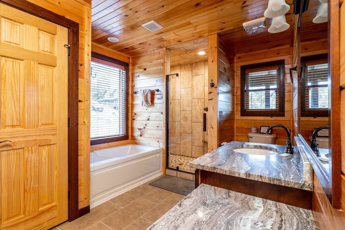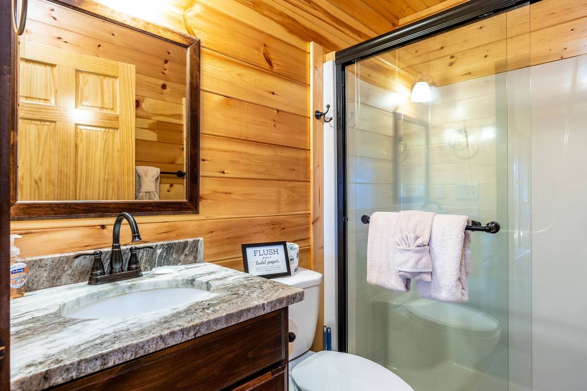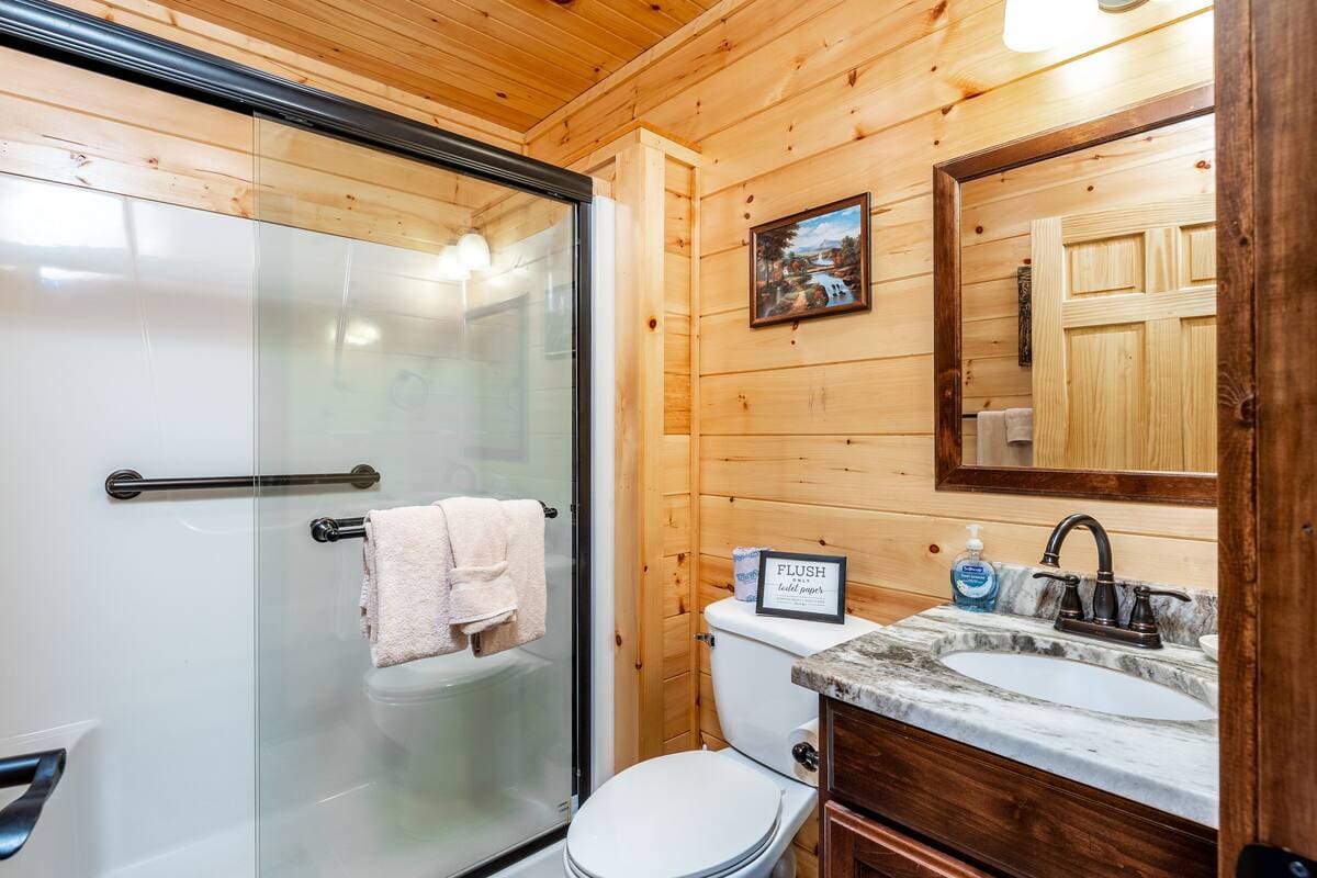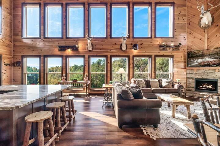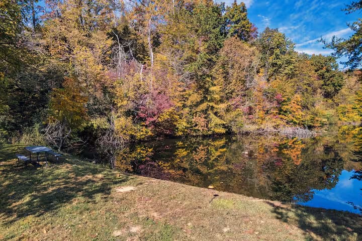This exquisite cabin is the perfect getaway for large families or groups of friends! Sitting on 2 acres, the 4000 sq. ft. home boasts a private lake, 5 bedrooms, 5.5 baths, a loft, a theater with 12 ft. screen, a game room, a hot tub, 5 decks with rocking chairs, and outdoor dining. With no steep hills, your great Smoky Mountain adventure awaits!!!!!!