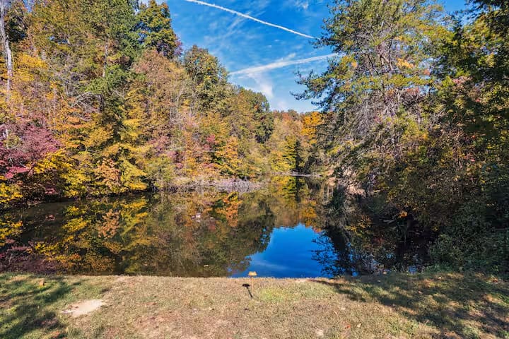 For the duration of your stay, you’ll enjoy access to the entire home, as well as the private lake, 2 acres of outdoor living space, grills for cooking your favorite meals, and a built-in fire pit. You’ll love the privacy our home offers, as well as the various entertainment options – game room, and home theater. This truly is the perfect destination for a large group.