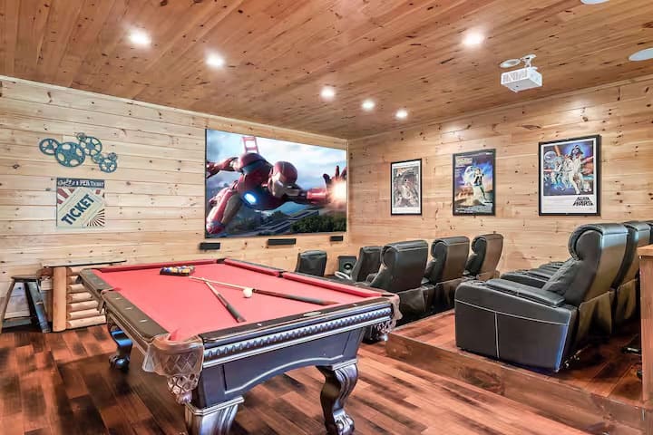 ☀ Home theater with 12 ft. screen, game room with pool table, video game system with 50+ games, board games, and more