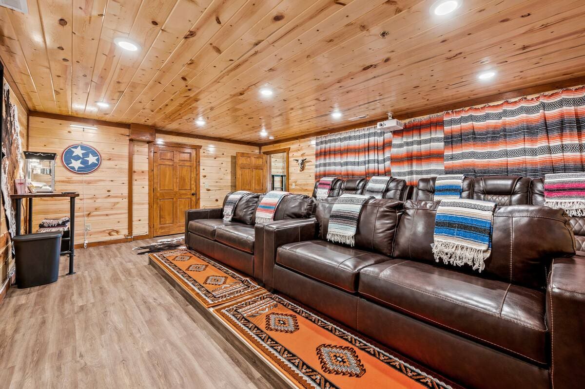 The cabin’s theater room offers the ultimate cinematic experience, with a large projection screen, comfortable theater-style seating, and immersive surround sound. Sit back, relax, and enjoy your favorite movies or shows with breathtaking mountain views as the backdrop.