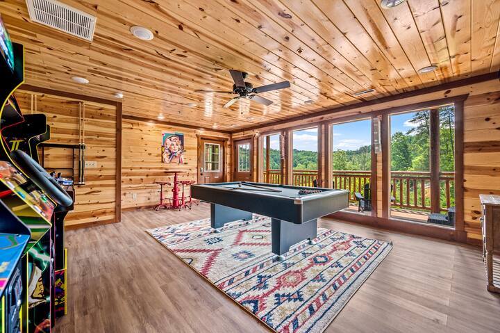 Indulge in luxury at this stunning 6-bed cabin with pool, hot tub, views, coffee bar, arcade, theater & upscale features. Relax in style with a private pool and hot tub, offering ultimate tranquility. Savor the finest brews at the elegant coffee bar. Enjoy endless entertainment with an arcade and theater. Every detail exudes sophistication, from the meticulously designed interiors to the breath-taking views. Experience a truly extraordinary retreat.