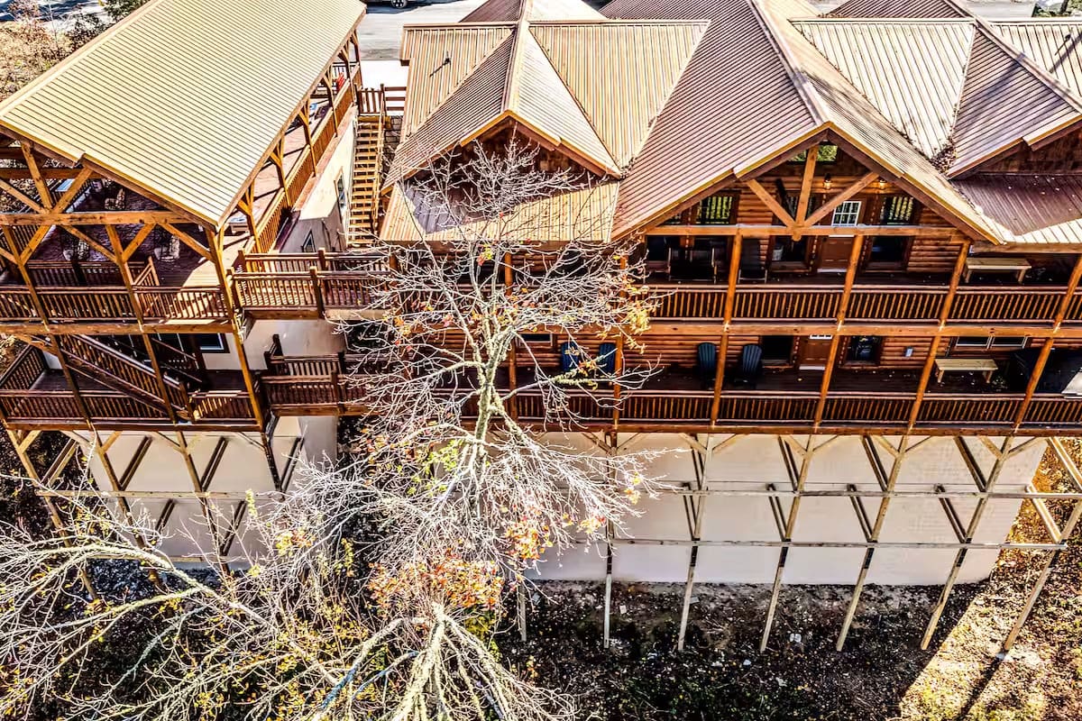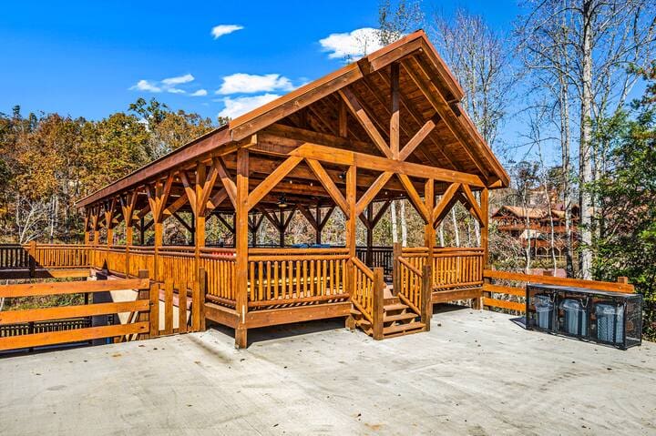 This exquisite cabin is the perfect getaway for large families or groups of friends! This 6000 sq. ft. home boasts a HUGE private pool, 8 bedrooms, 8.5 baths, a massive pavilion with 2 grills, games and more , a giant game room, TWO hot tubs, 5 decks with rocking chairs, swing chairs and outdoor dining. With no steep hills, your great Smoky Mountain adventure awaits…..