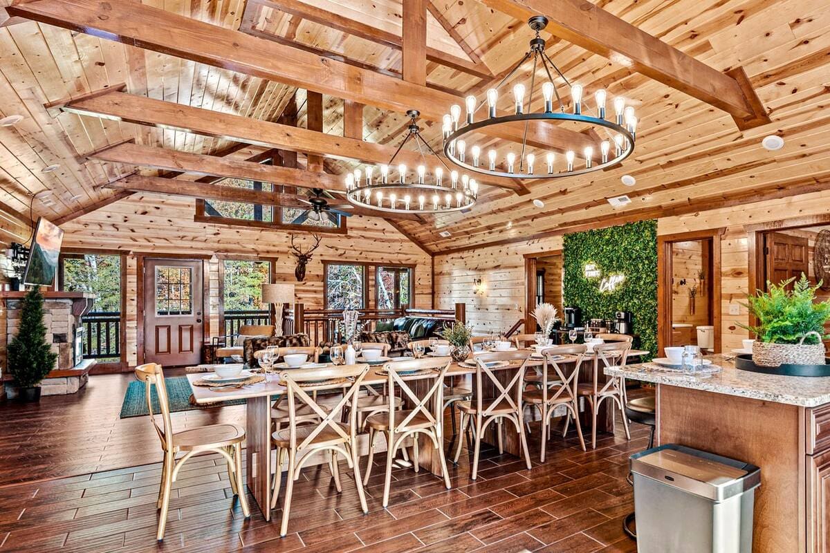 The large great room offers floor-to-ceiling windows to let all the natural light in. Cozy furniture and a luxurious fireplace make this room perfect for gathering the whole crew together for great conversation. The open floor plan creates a natural flow into the dining room with a large dining table for sit-down meals with seating for at least 14.
