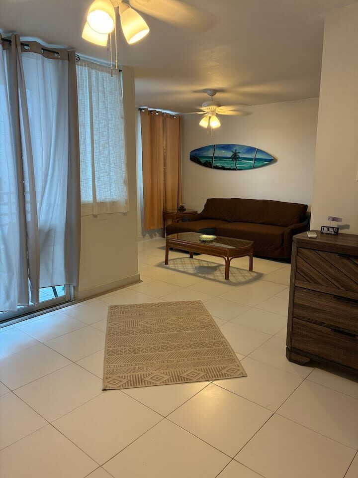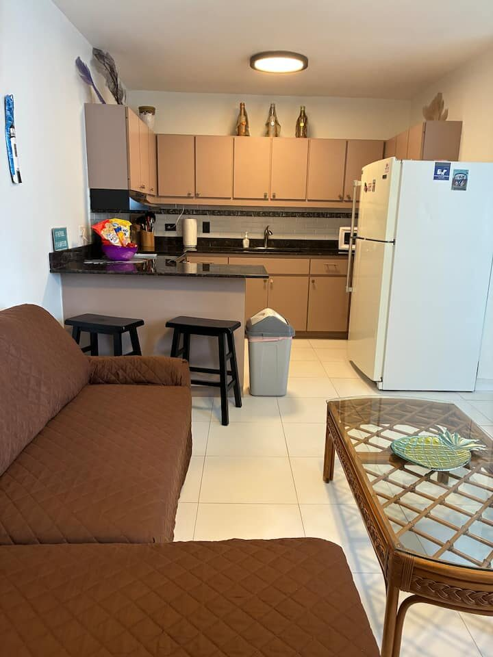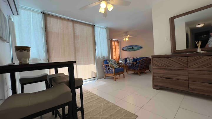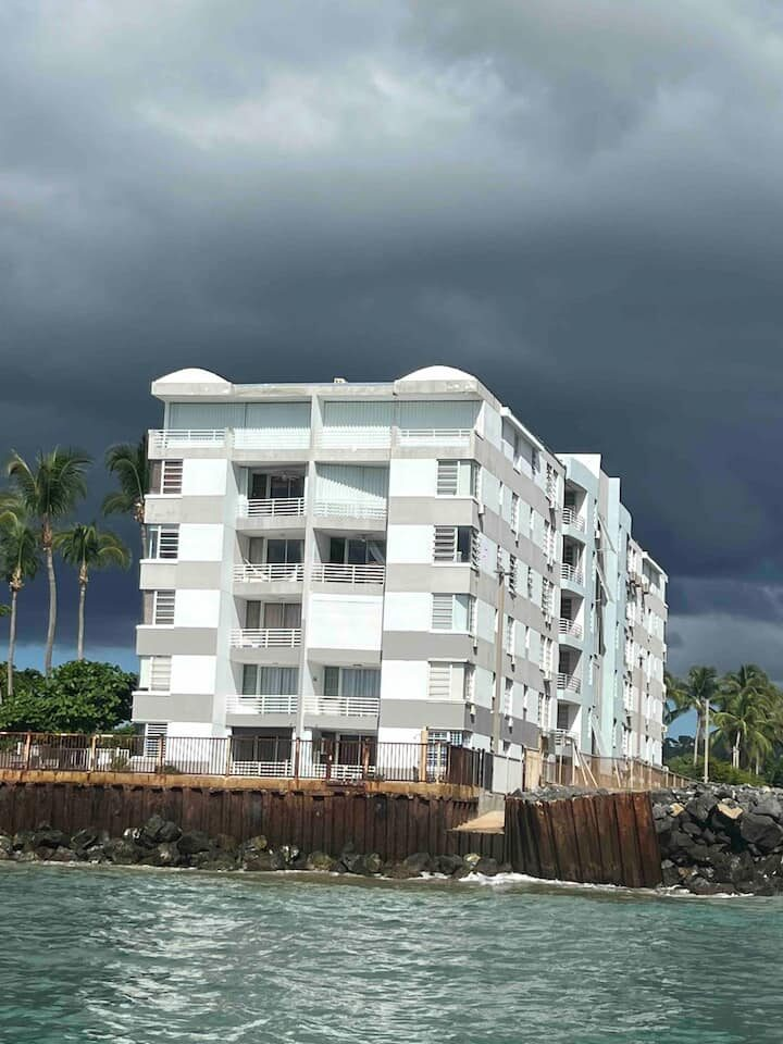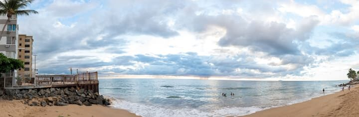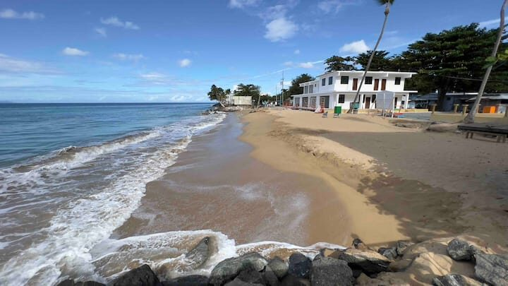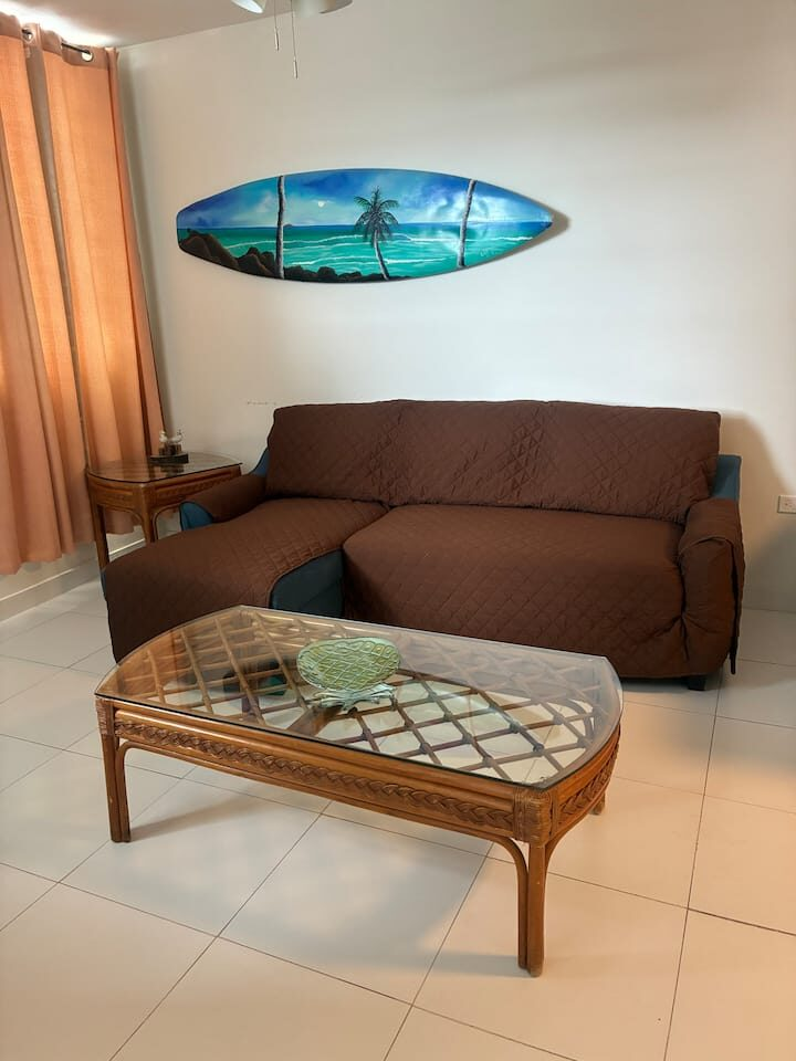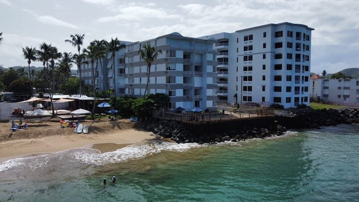 Beachfront scenic condo in Rincon, PR. The condo building sits on the beach. You are a quick elevator ride to the sand and the pool with ocean views from pool deck. Just mins to great surfing. Unit has small ocean view from side of building balcony so you have island & ocean sounds! Calm waters for swimming is always an option out front! Many great restaurants & bars close by and less than a mile to Rincon square. Recently updated interior with new TV’ & high speed internet! A/C in each room.
