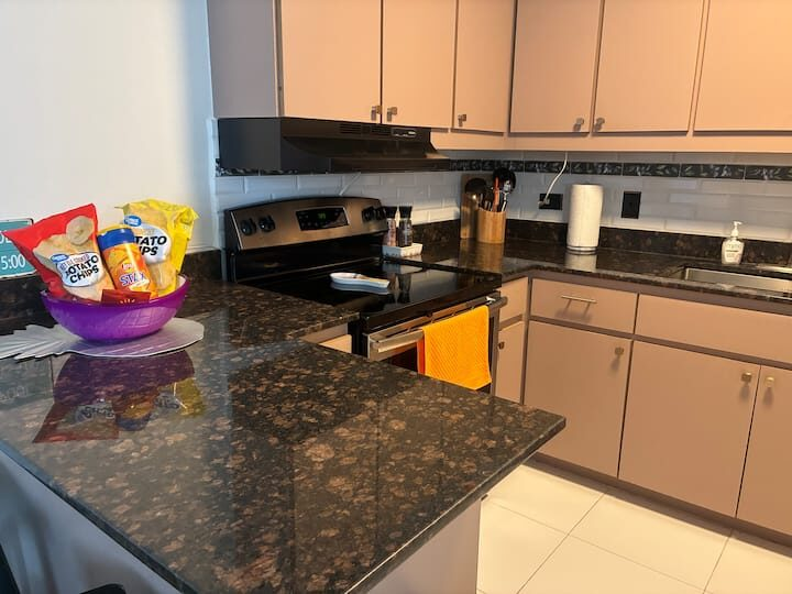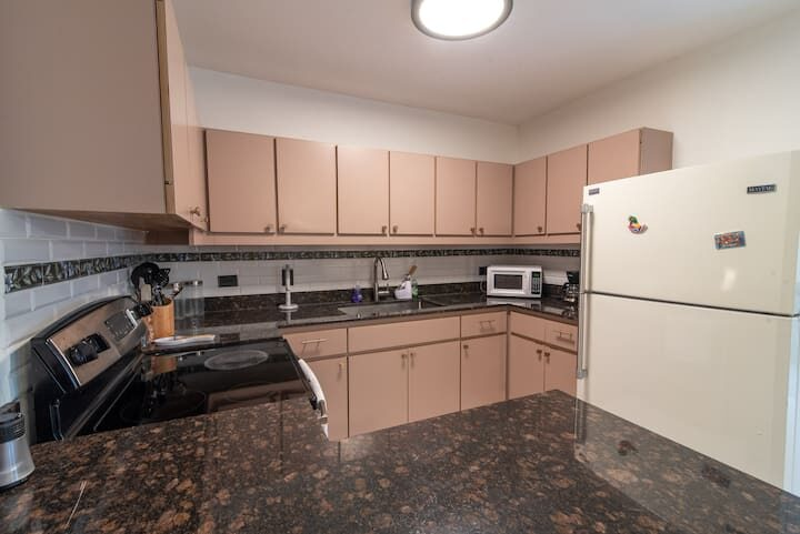Two bedroom with a full kitchen and living room on 5th floor with elevator access. The pool and hot tub area are shared with the other guests in the building.