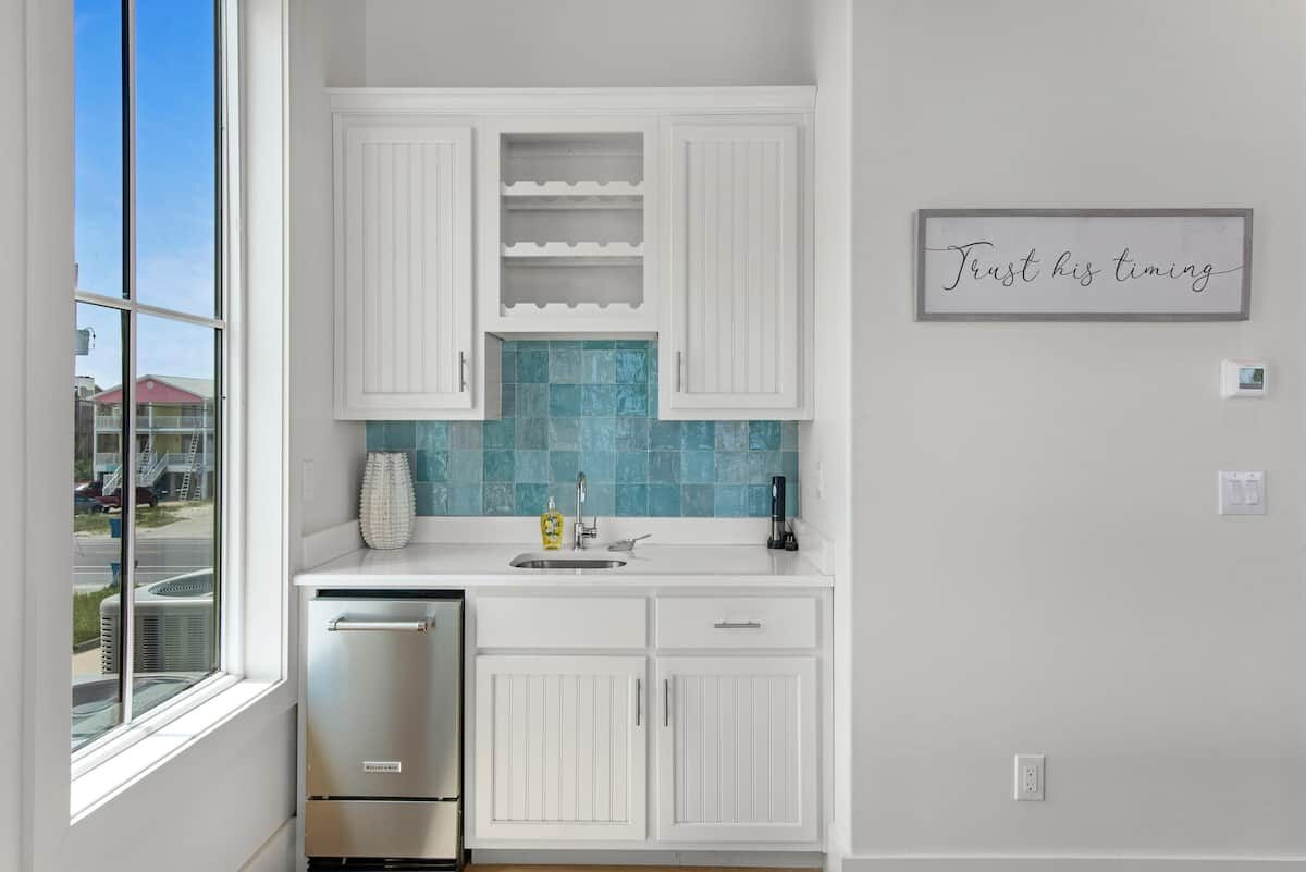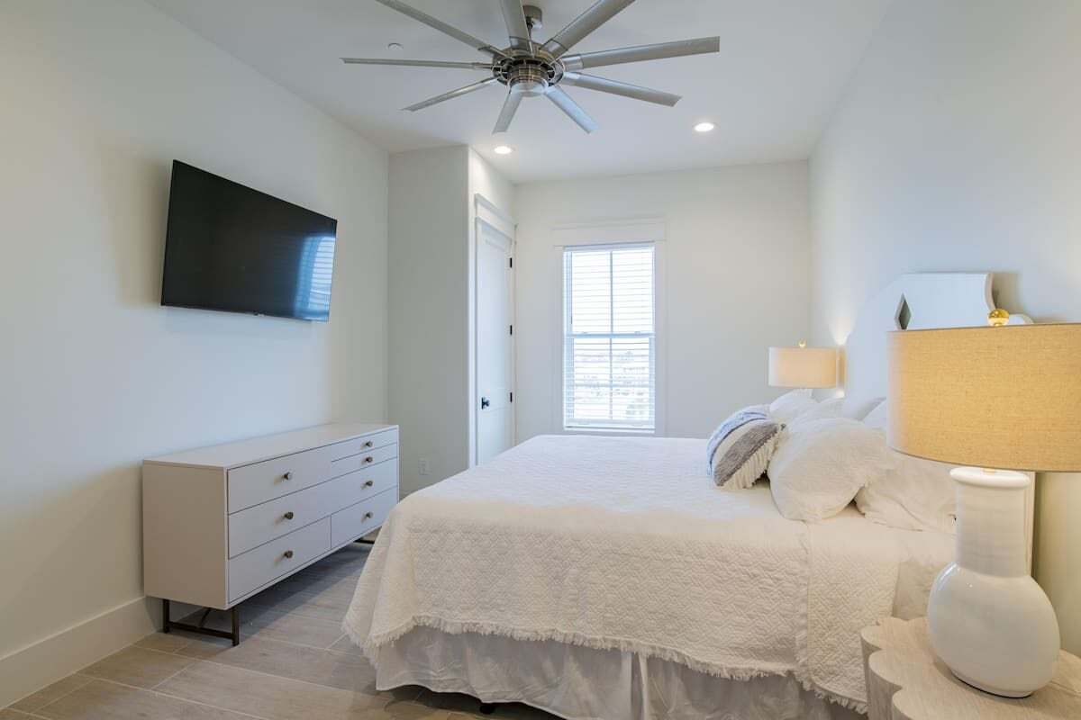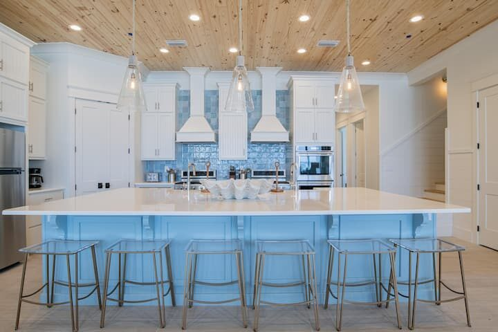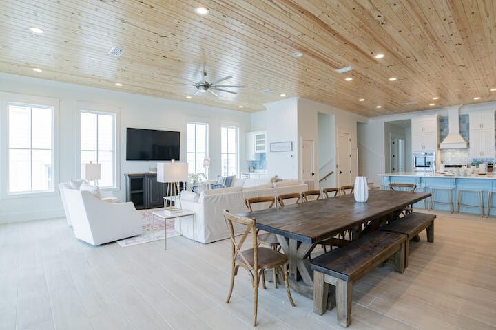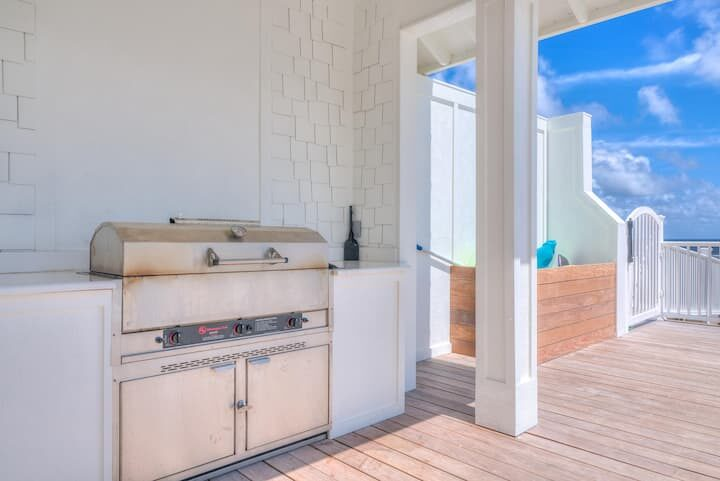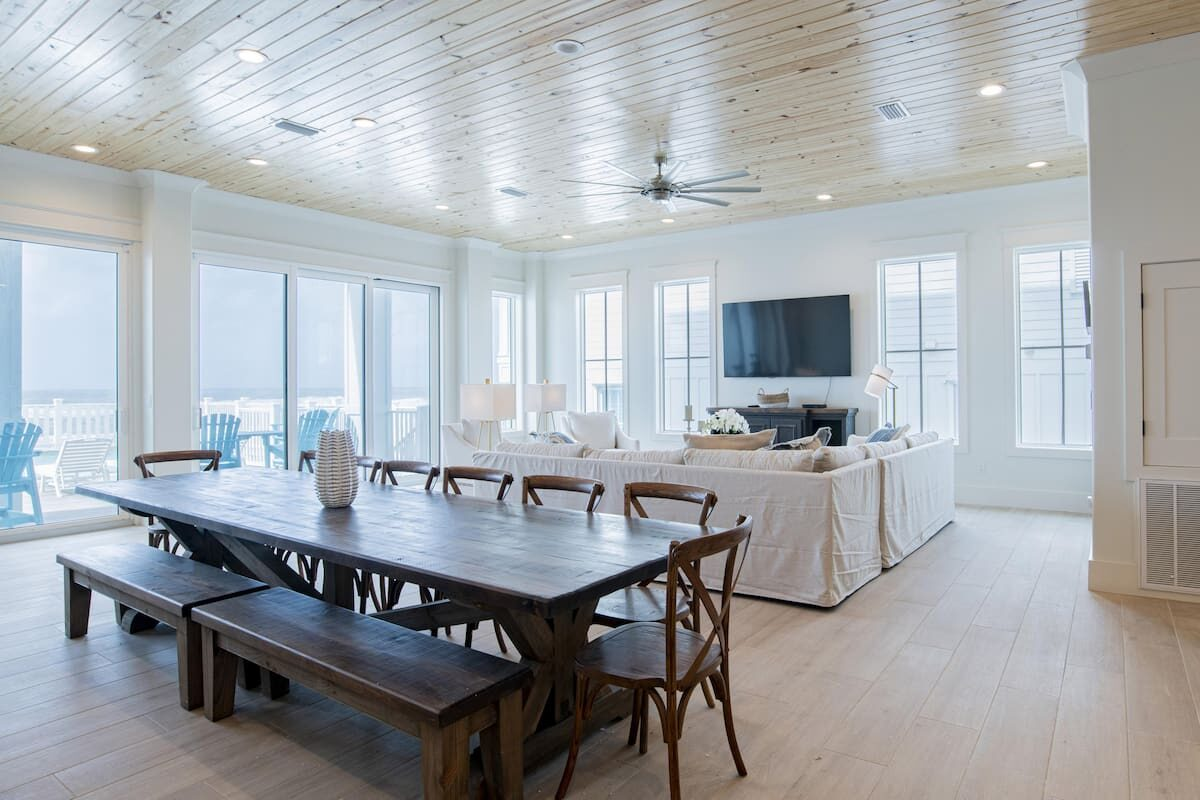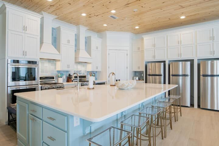 We stocked and equipped Seaside West’s gourmet-style kitchen to be able to feed an entire group with ease. Stainless steel appliances include 3 refrigerators, 3 dishwashers, and multiple cooktops and ovens. The indoor dining area seats up to 30+ people at two 12-foot tables. The sprawling kitchen island, located near the dining area, seats 6 more. On the deck, two more al fresco dining tables set the stage for an impressive sunset dinner in the gulf breezes.