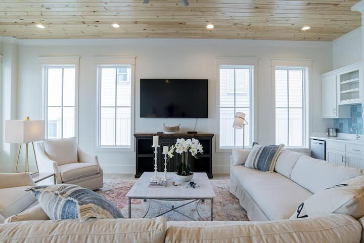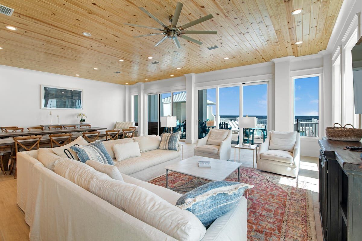 Professional interior design makes the most of Seaside West’s 7,000 square feet of heated and cooled living space, plus an additional 2,000 square feet of decks, porches and balconies.