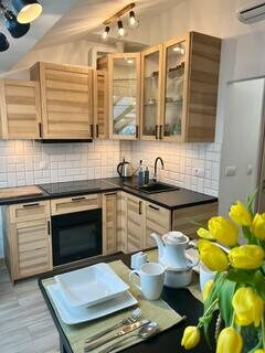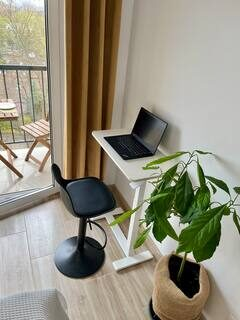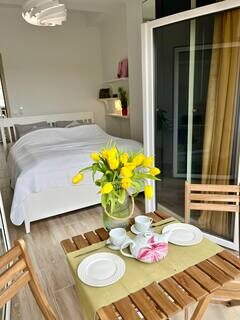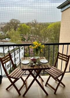 Bright 🌞 and fully equipped apartment, especially suitable for long stays. Quiet BEDROOM with a large double bed 🛏️, a small south-facing balcony, and a view. Fully equipped KITCHEN with a cozy LIVING ROOM. Numerous small shops, cafes, and stores in the immediate vicinity. 🛒☕ 26 walking minutes to the market square or main train station. Ideal for couples or an individual. OPTION: +2 additional persons can sleep on the fold-out sofa in the living room with the kitchen.
