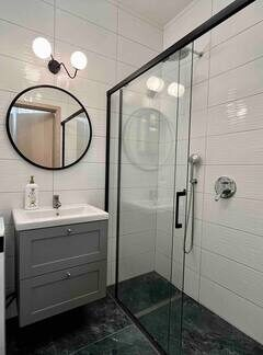 BATHROOM: Includes a walk-in shower, toilet, sink, and a washing machine.