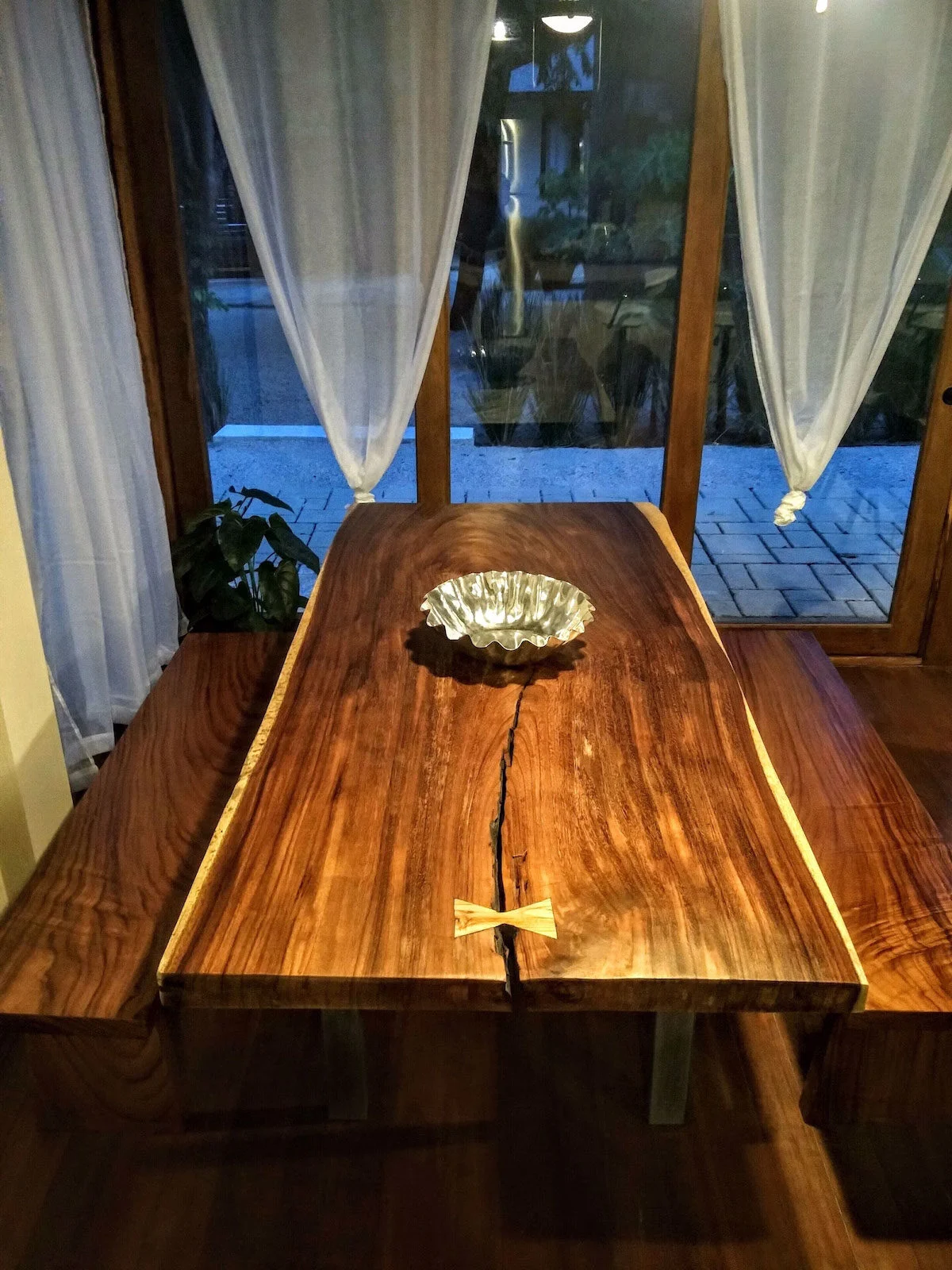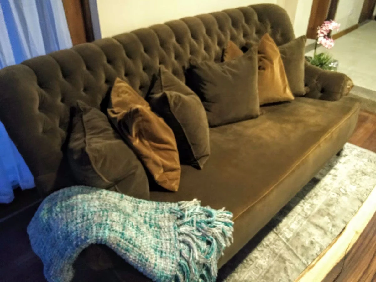 The open concept living/dining/kitchen is custom furnished in local teak. The glass and teak french doors open on to the landscaped private terrace. Our villa has a private teak eating area with personal barbeque and two lounge chairs that connect to the SHARED Rancho/BBQ/Bano and Pool.