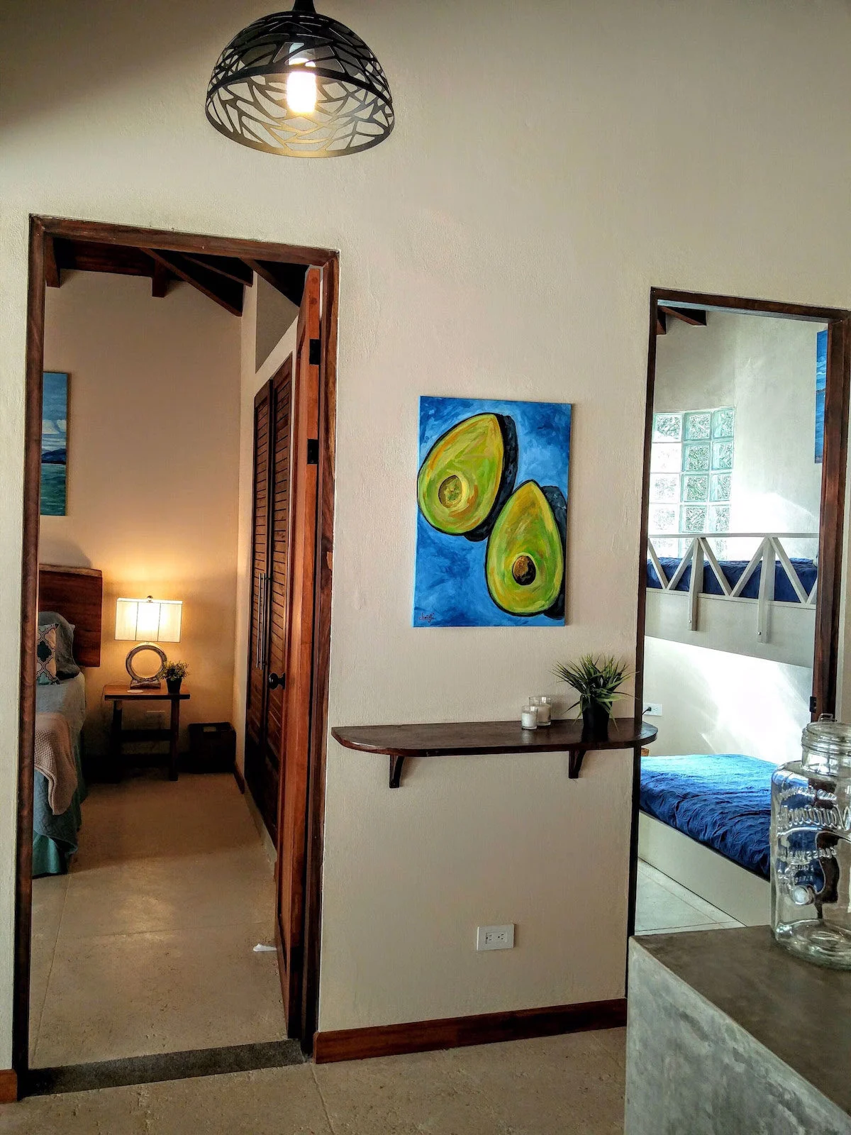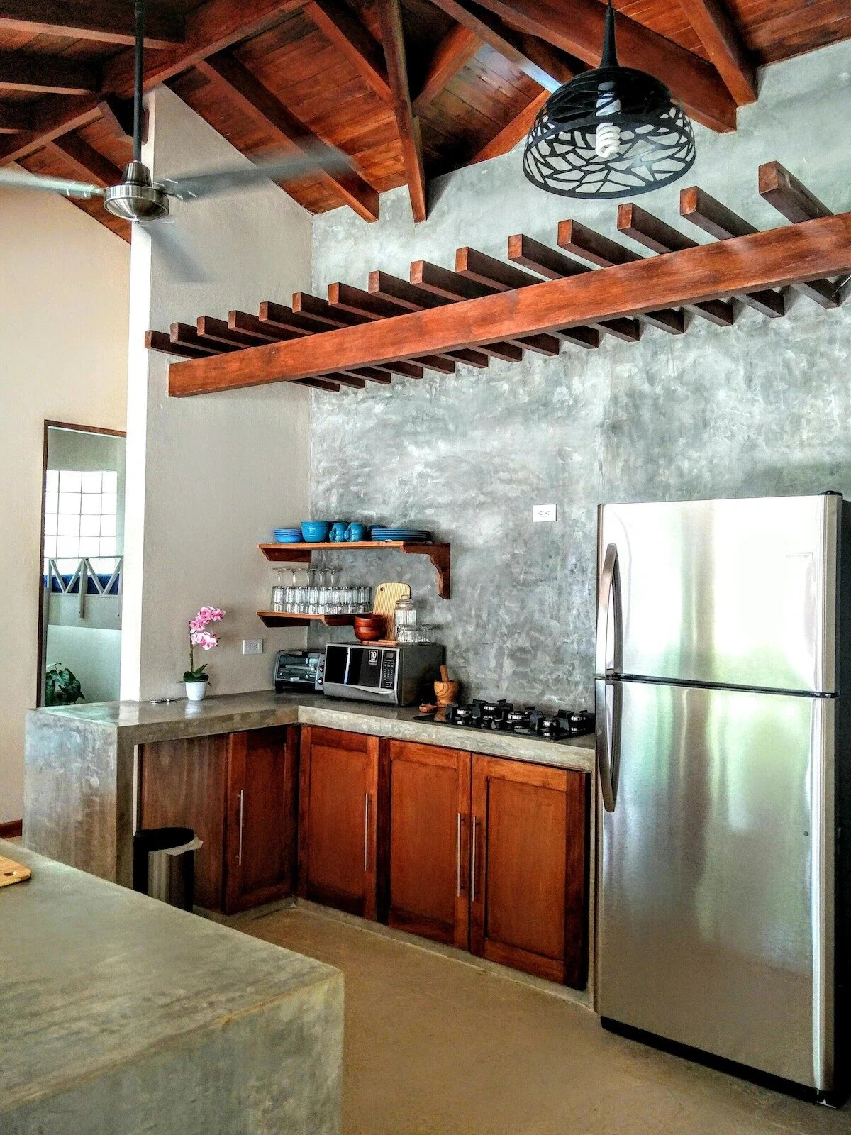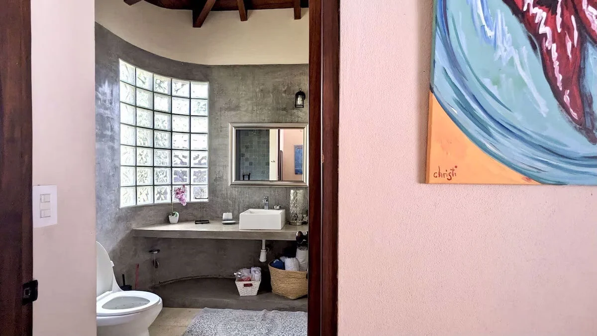The Casita was beautifully constructed by top builders in the area using local and natural materials of teak, polished concrete and stone. The ceilings are high and the sliding French Doors open to create an outdoor living space in accompaniment with the private poolside terrace. Two identical bedrooms with custom teak furniture, pillow top Queen mattresses and nice linens and two teak desks with chairs for working.