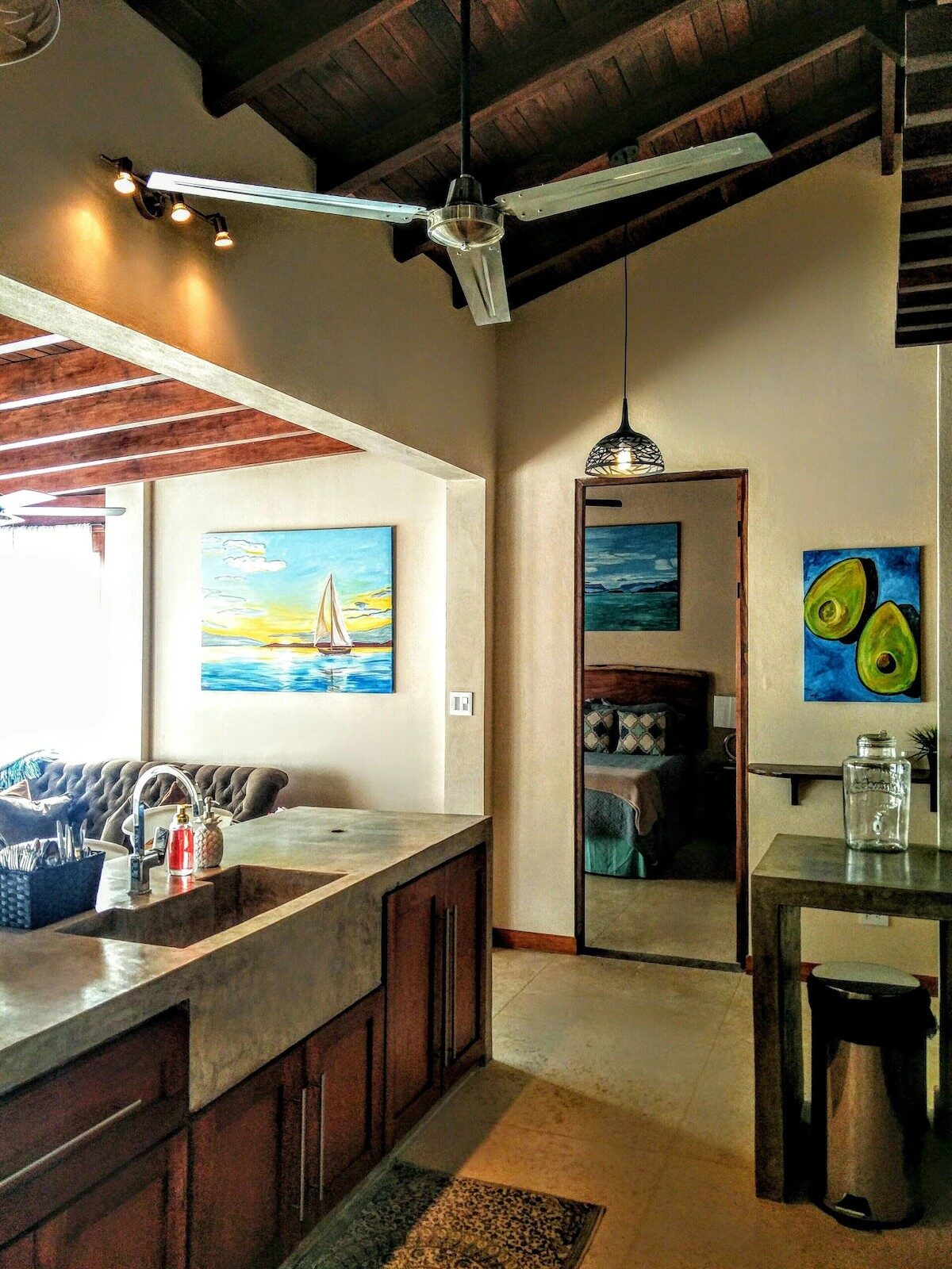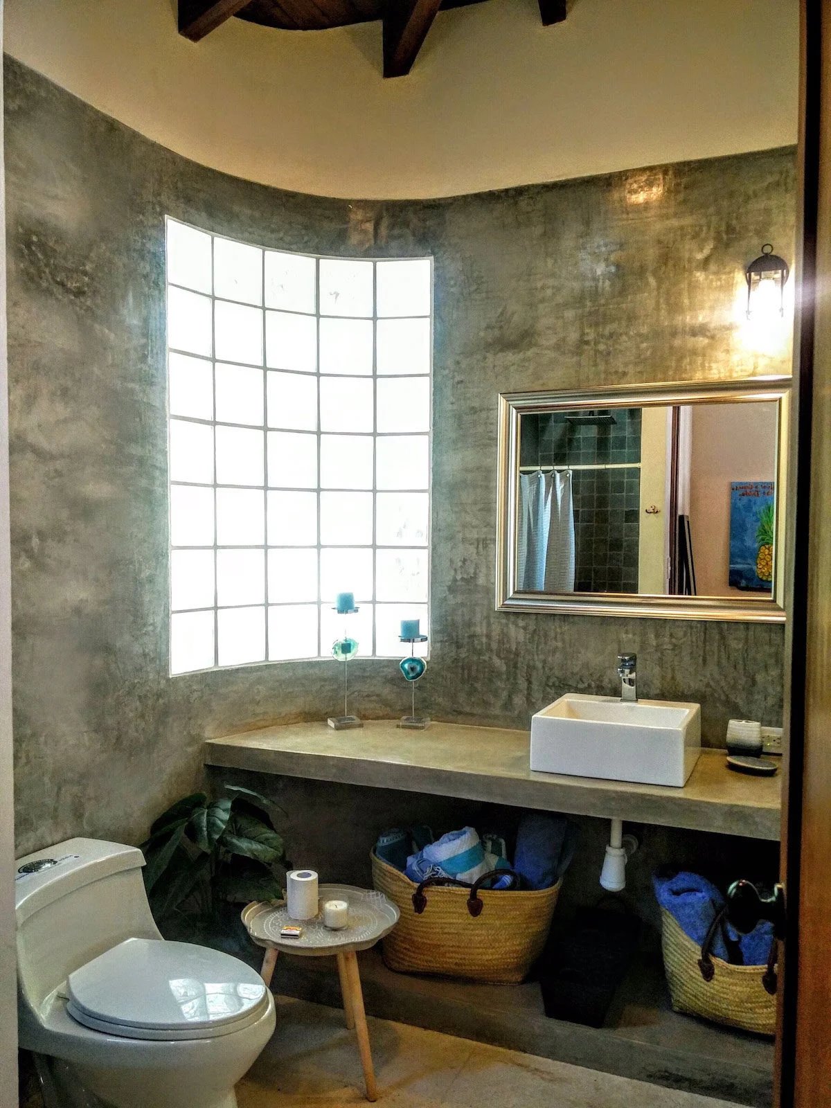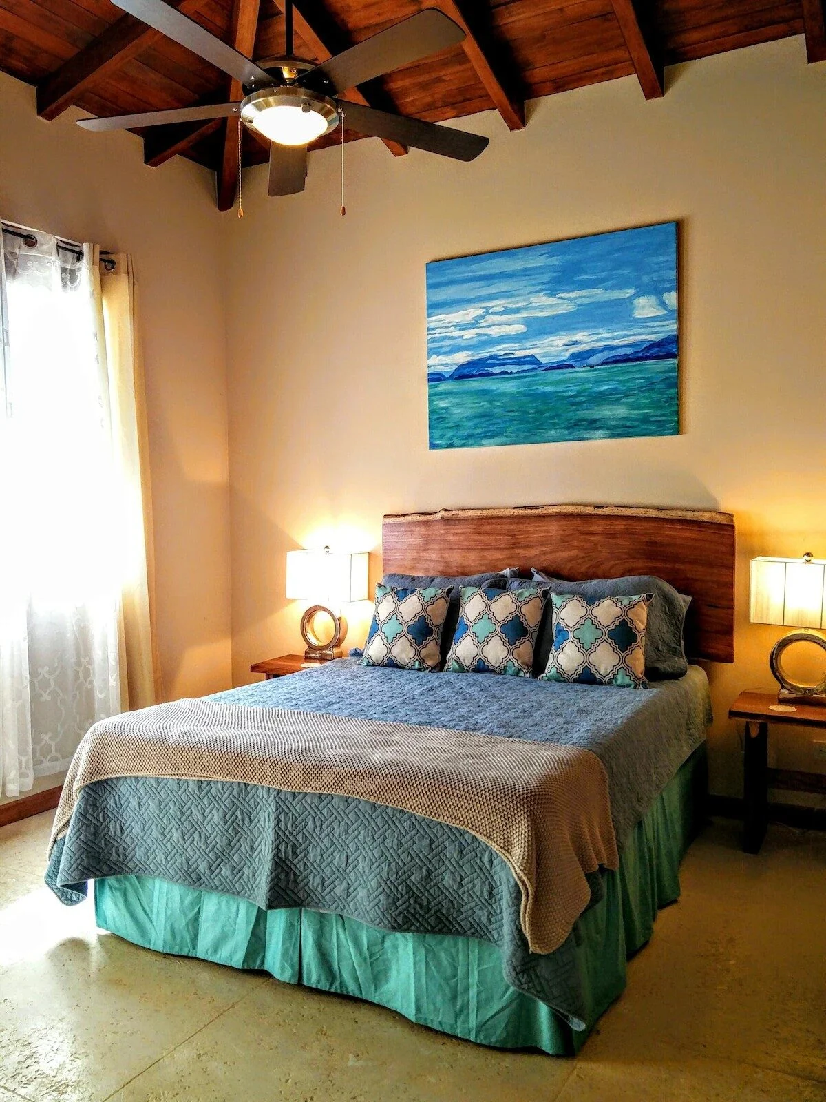 The Casita was beautifully constructed by top builders in the area using local and natural materials of teak, polished concrete and stone. The ceilings are high and the sliding French Doors open to create an outdoor living space in accompaniment with the private poolside terrace. Two identical bedrooms with custom teak furniture, pillow top Queen mattresses and nice linens and two teak desks with chairs for working.