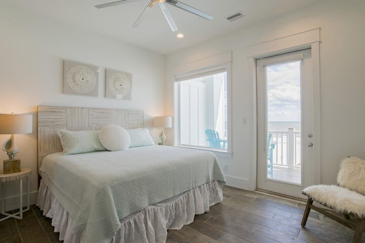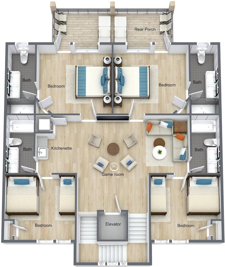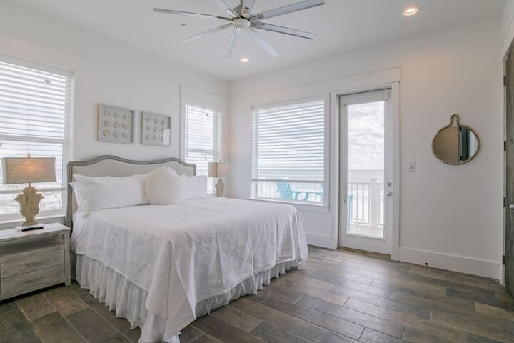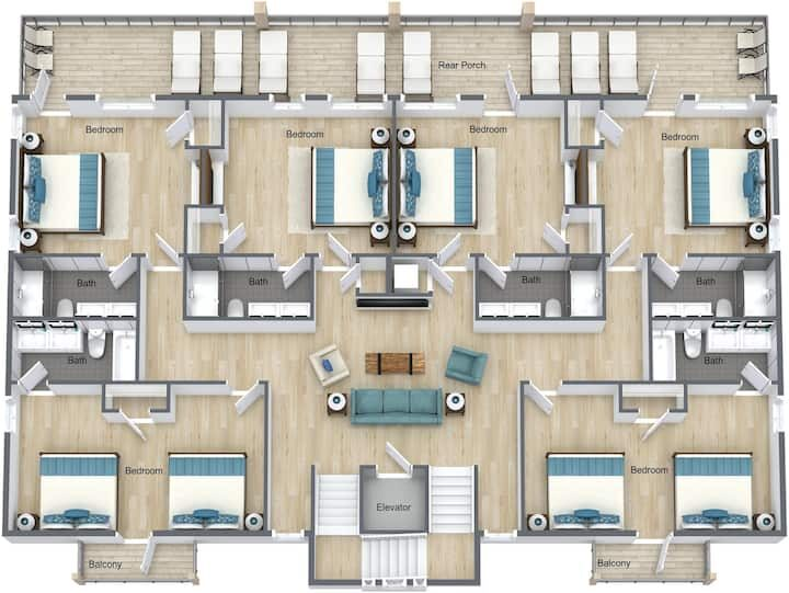 Second Floor (sleeps up to 16): 4 Gulf-front master bedrooms with private balconies and bathrooms. 2 north-side rooms with 2 king-sized beds per room + private en-suite bathrooms. Media/sitting area with flat-screen TV on the second floor.