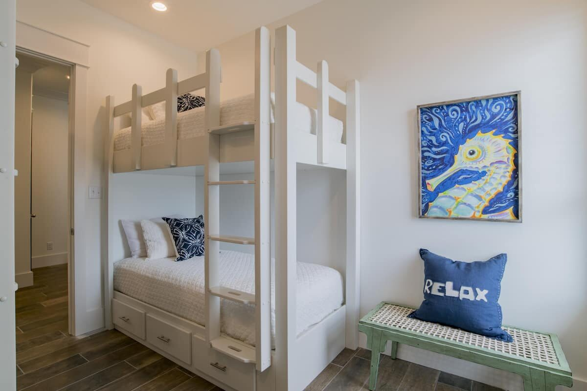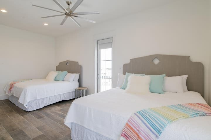 Third Floor (sleeps up to 16): 2 Gulf-front master bedrooms with private balconies and bathrooms. 2 north-side bedrooms with custom-made queen-over-queen bunk beds and twin XL-over-twin XL bunk beds (sleeps up to 6 per bunkroom) + private bathrooms for each bedroom. Additional TV lounge area for the top floor + wet bar.